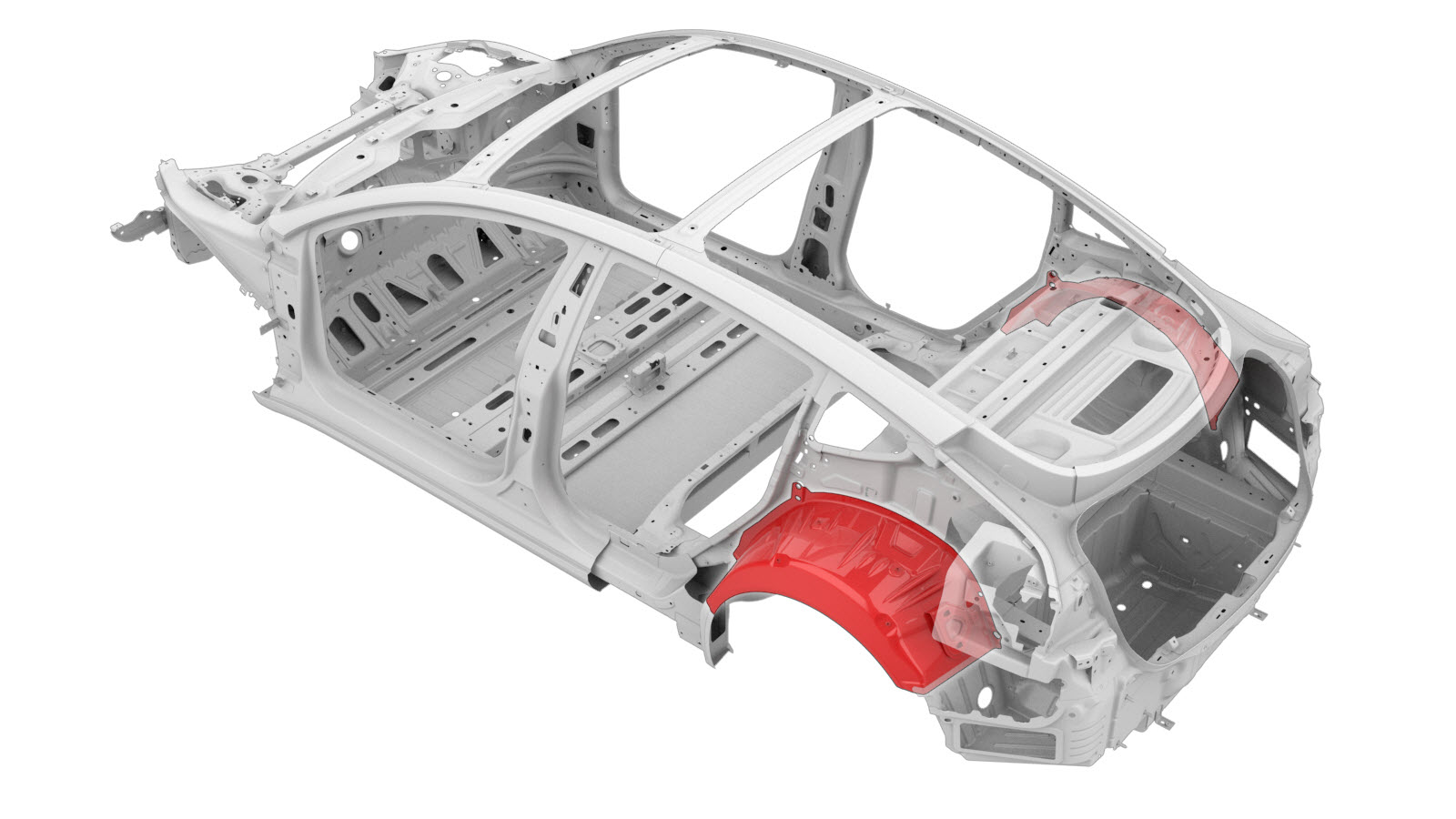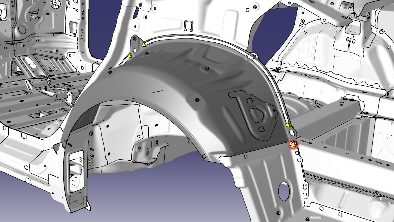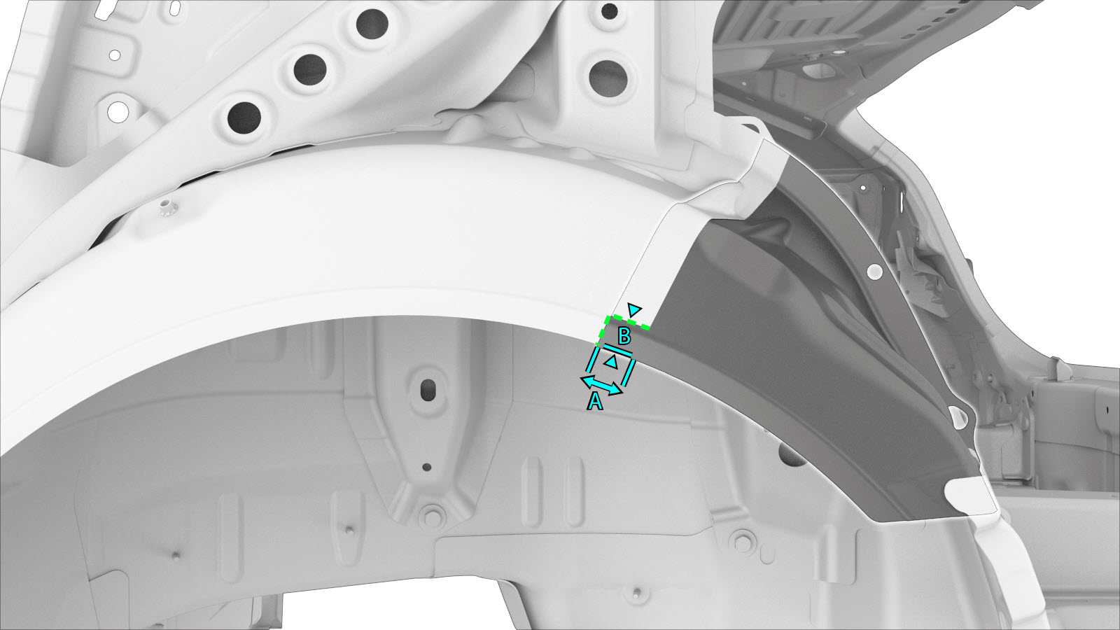| The Rear Wheel Arch (shown below) is a single assembly, and can be replaced as a single repair: | Alternatively, instead of replacing the complete Rear Wheel Arch, the rear section of the Rear Wheel Arch can be replaced using a portion of the complete Rear Wheel Arch Assembly service part using the cut lines described below. |