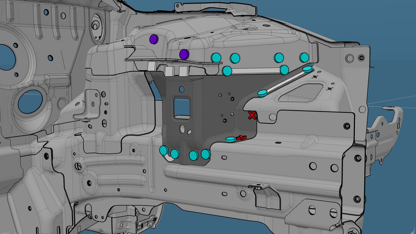 NoteA red X indicates a location where a factory-installed fastener is not being replaced.