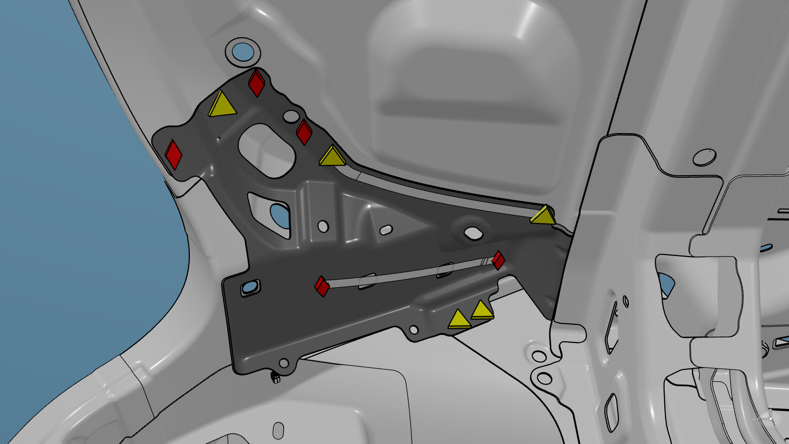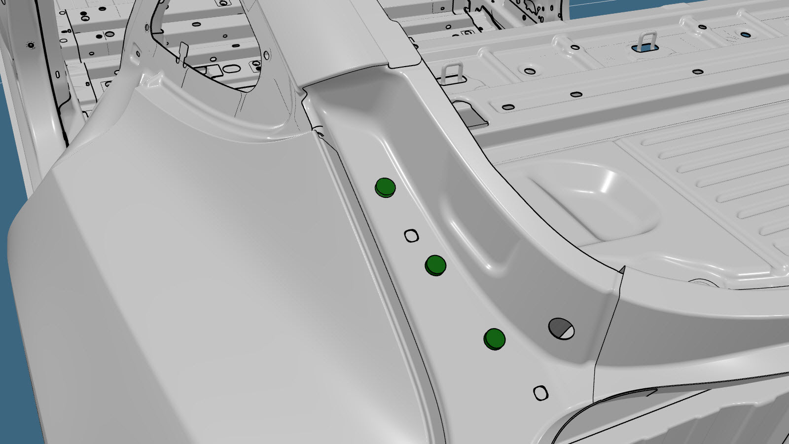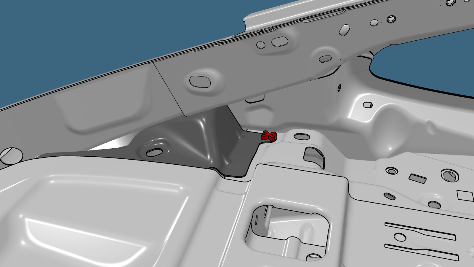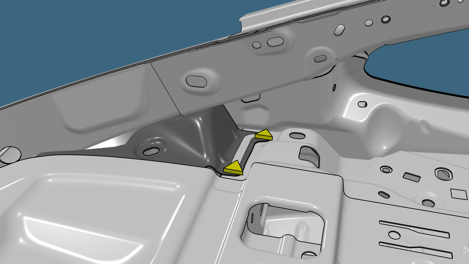 NoteInstall one countersunk rivet on each side of the original factory SPR location, as shown below. - Apply structural adhesive to the mating surfaces on the vehicle and the new component or components.