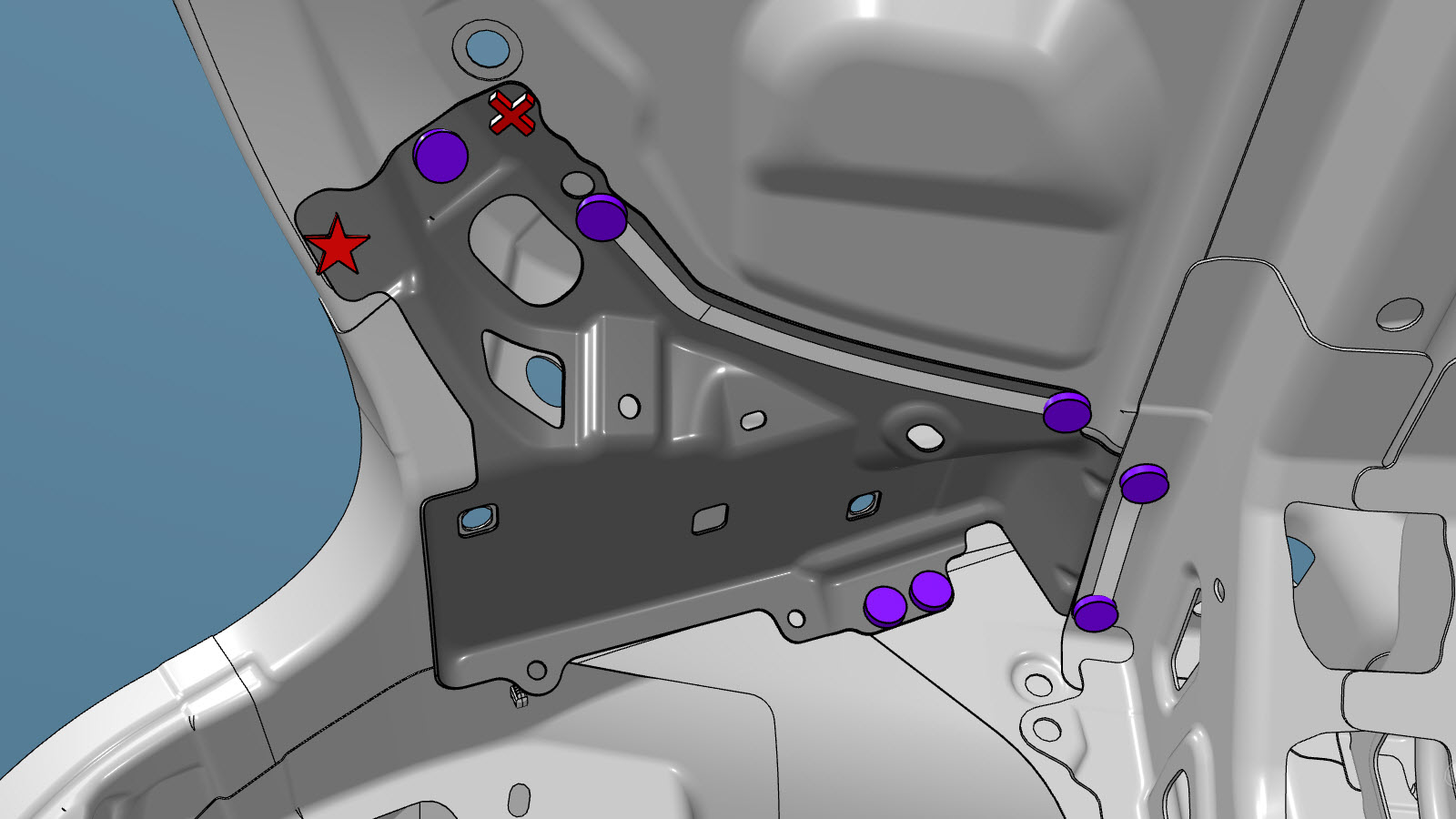 NoteA red X indicates a location where a factory-installed fastener is not being replaced.