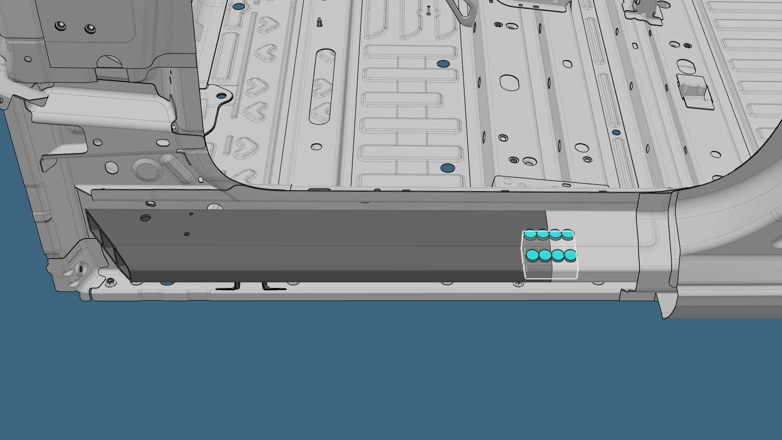 NoteUsing the existing holes in the outer Cell 3 reinforcement plate as guides, drill 8 mm holes for bolts through the Sill Insert portion still in the vehicle (do not damage the SPAC nuts on the inner Cell 3 reinforcement plate). - Apply structural adhesive to the mating surfaces on the vehicle and the new component or components.