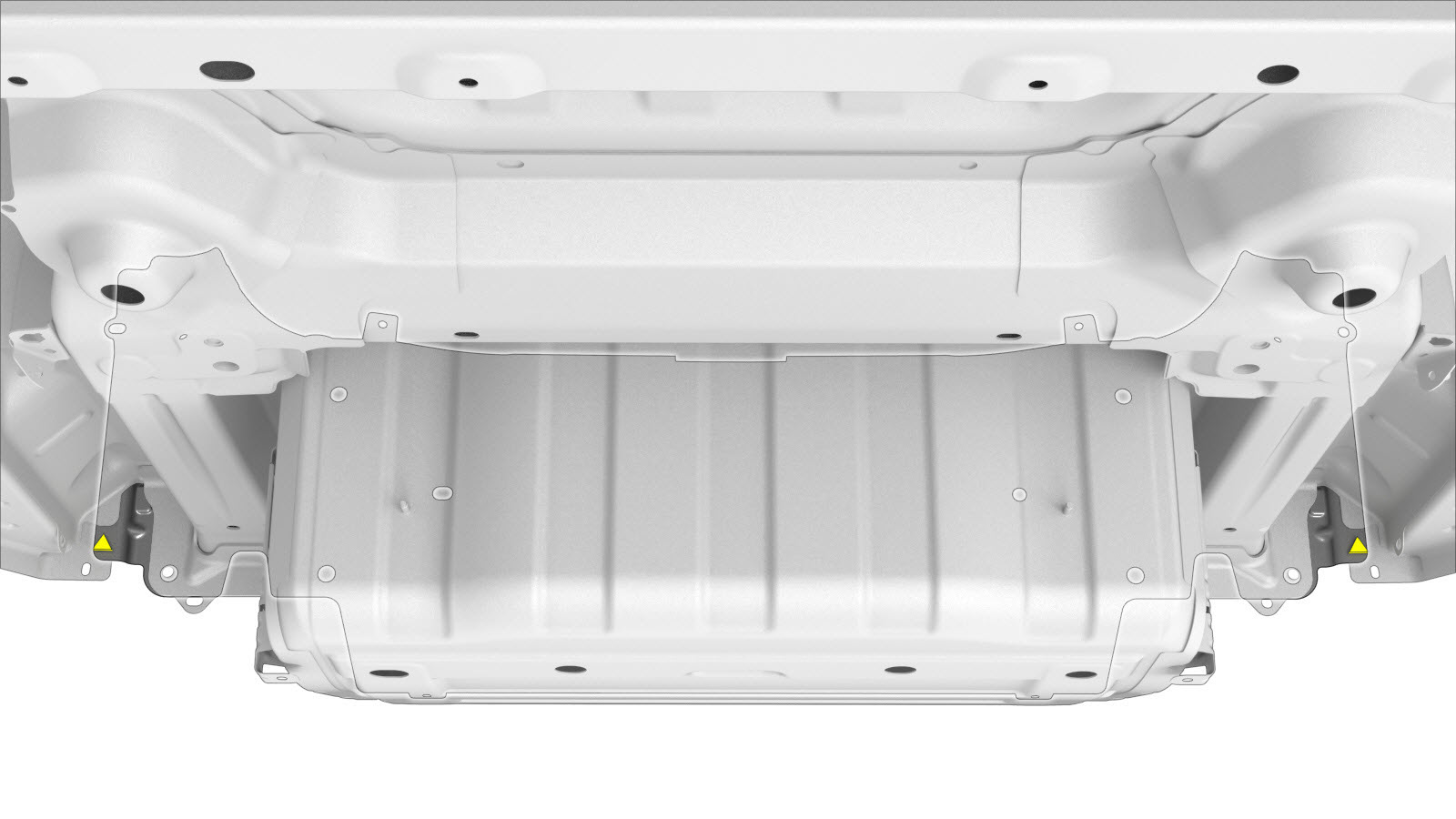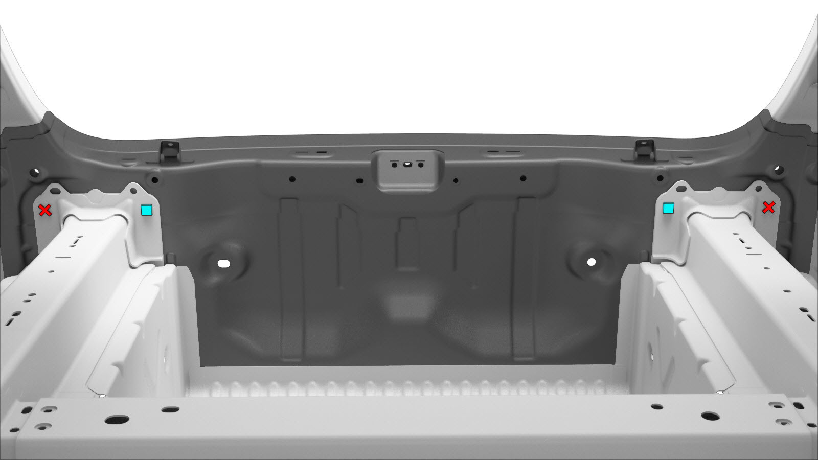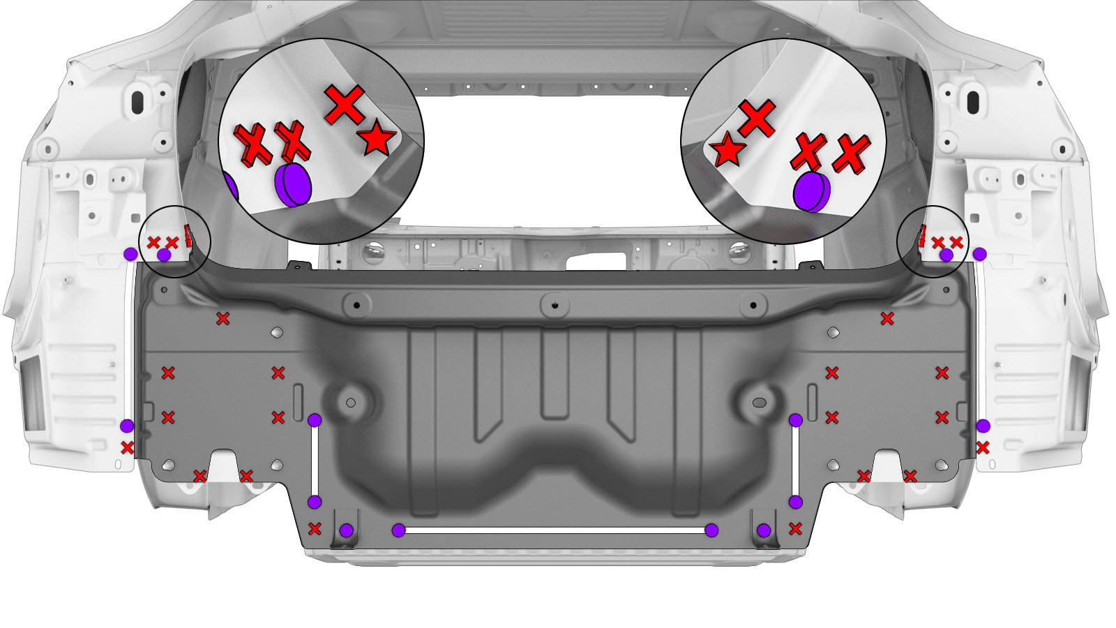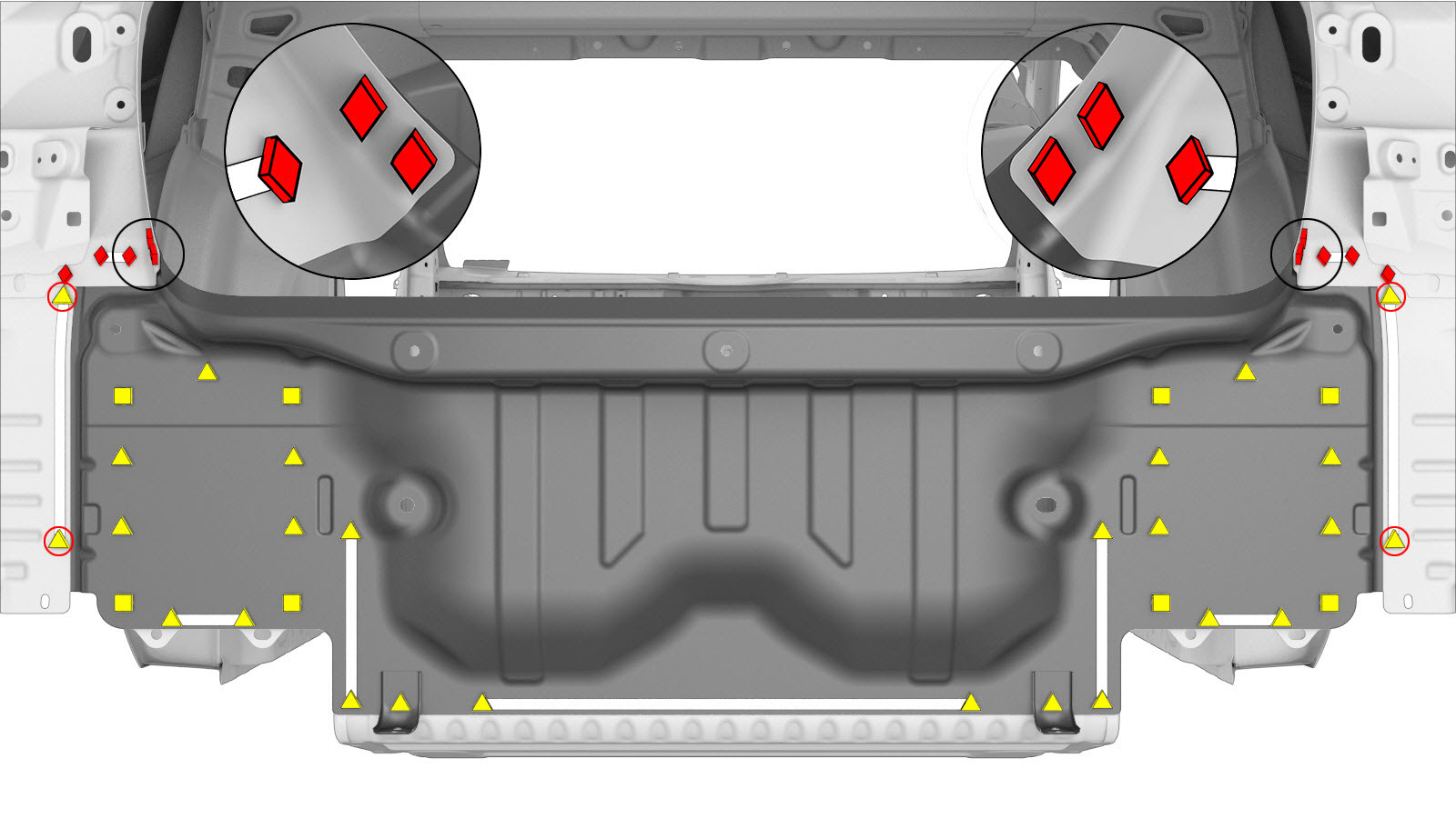 NoteMake sure that the rivet in the highlighted area connects all underlaying panels. - Apply structural adhesive to the mating surfaces on the vehicle and the new component or components.
