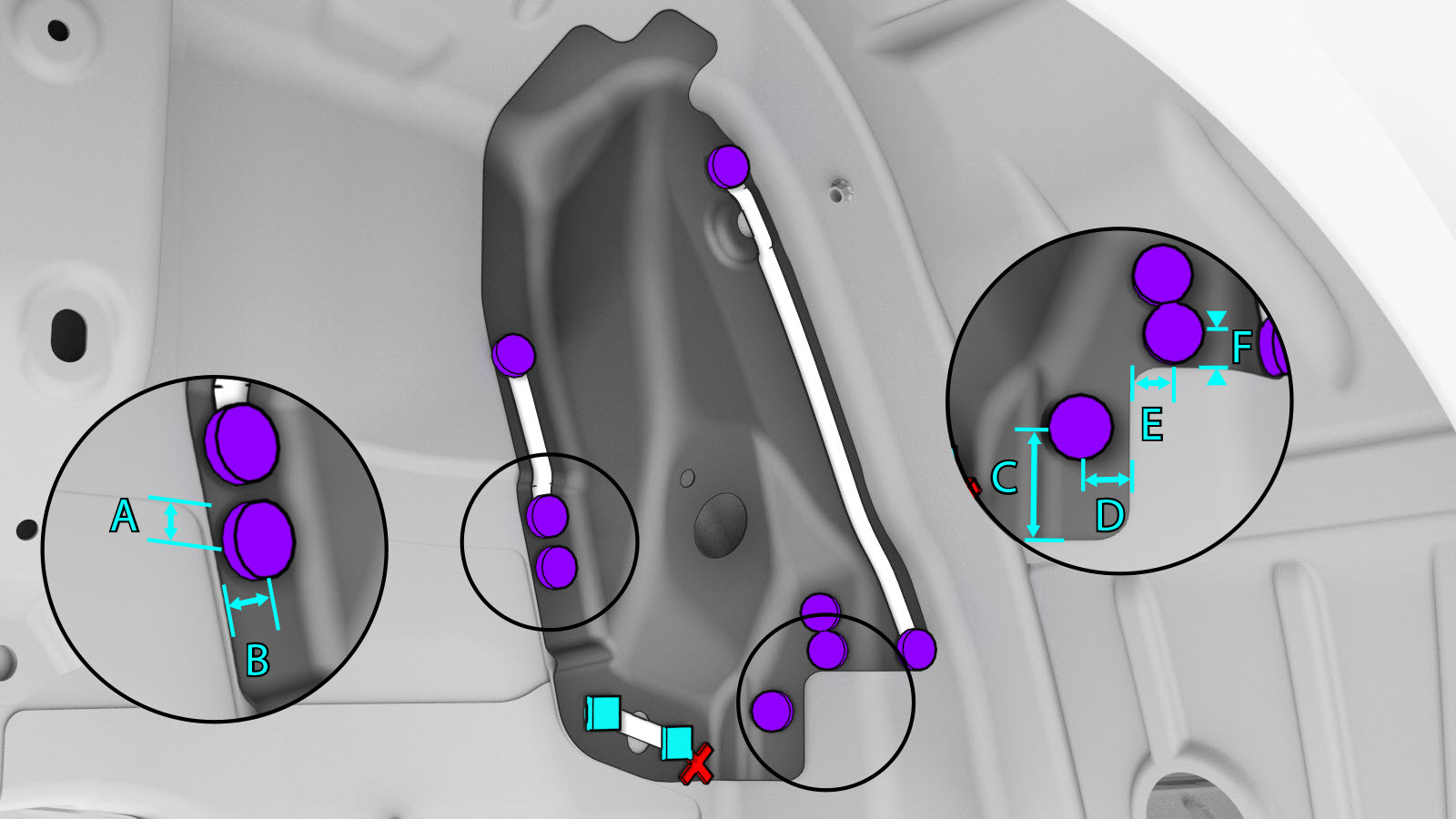 NoteA red X indicates a location where a factory-installed fastener is not being replaced.
