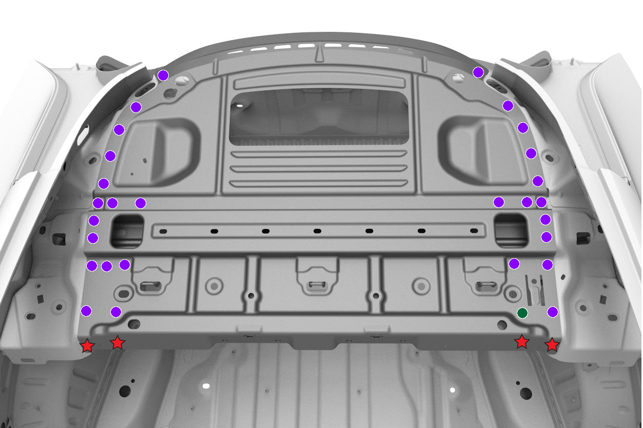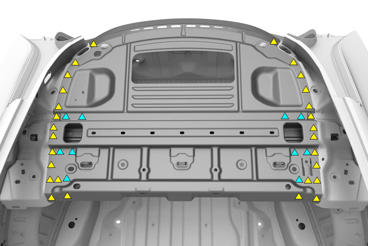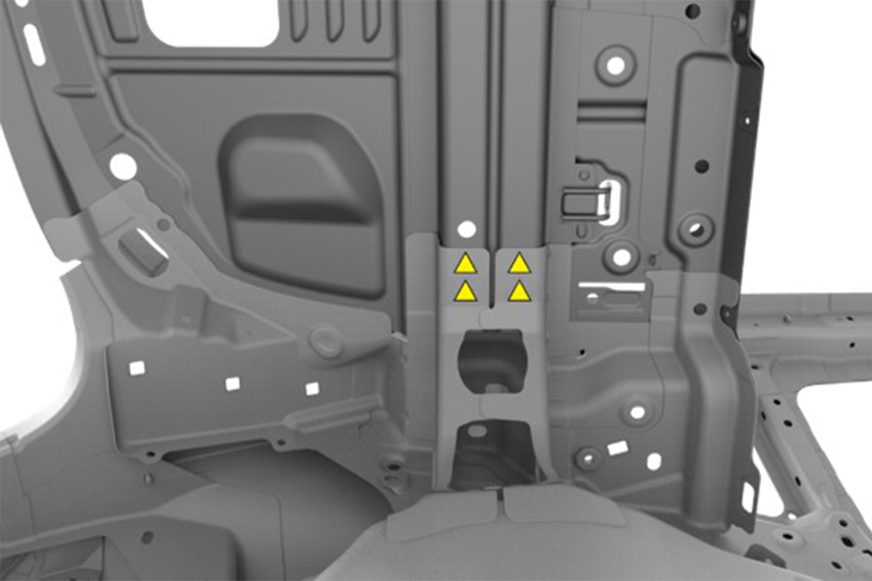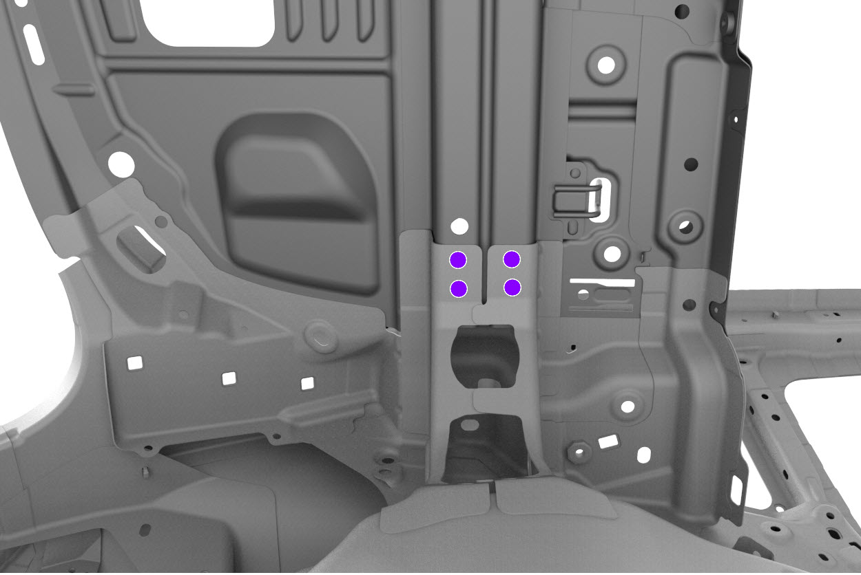 NoteThe countersunk rivet is for the LH side only to avoid interference with the TPMS module. - Apply structural adhesive to the mating surfaces on the vehicle and the new component or components.