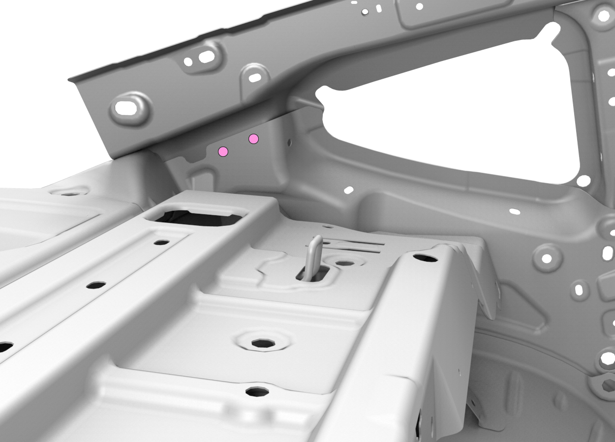NoteThe countersunk rivets are installed on either side of the hole where a factory SPR was removed. - Apply structural adhesive to the mating surfaces on the vehicle and the new component or components.