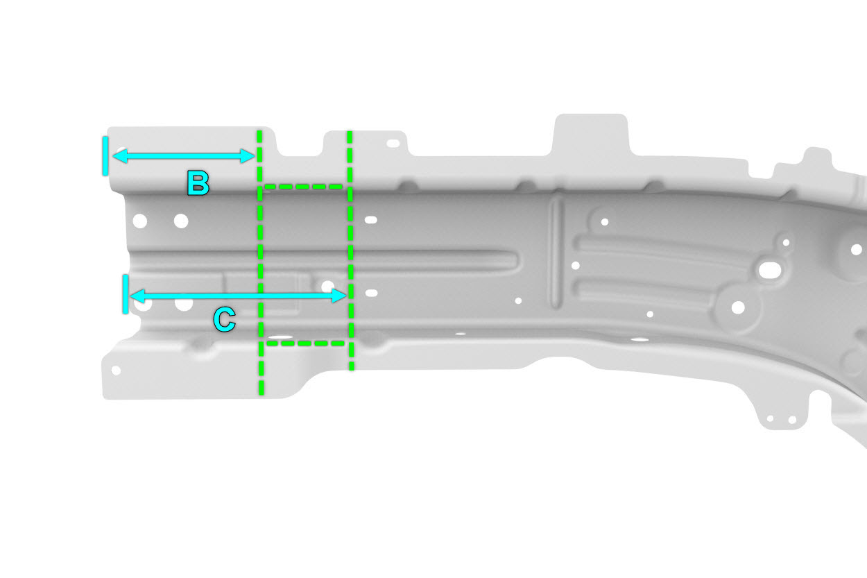 - Cut one of the new Front Frame Rail Inner components as indicated below to make the new component.
