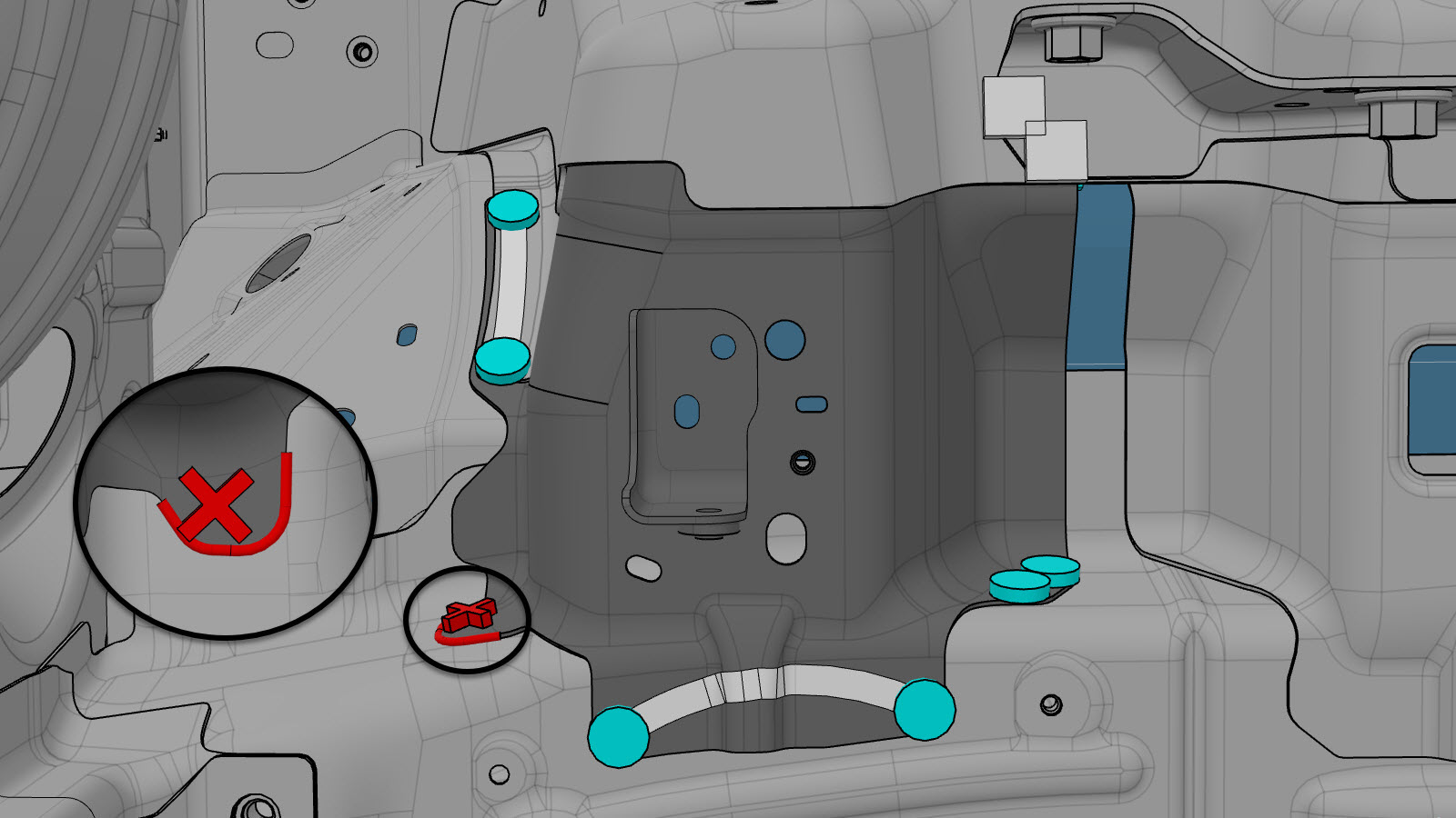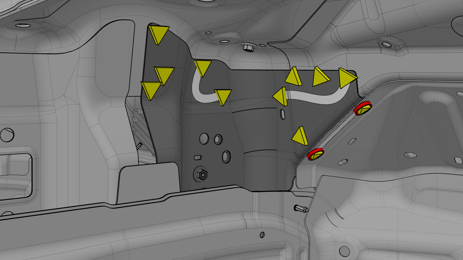 NoteA red X indicates a location where a factory-installed fastener is not being replaced.NoteInstall a rivet in the location circled in red only if a weld was removed from that location when the original component was removed.