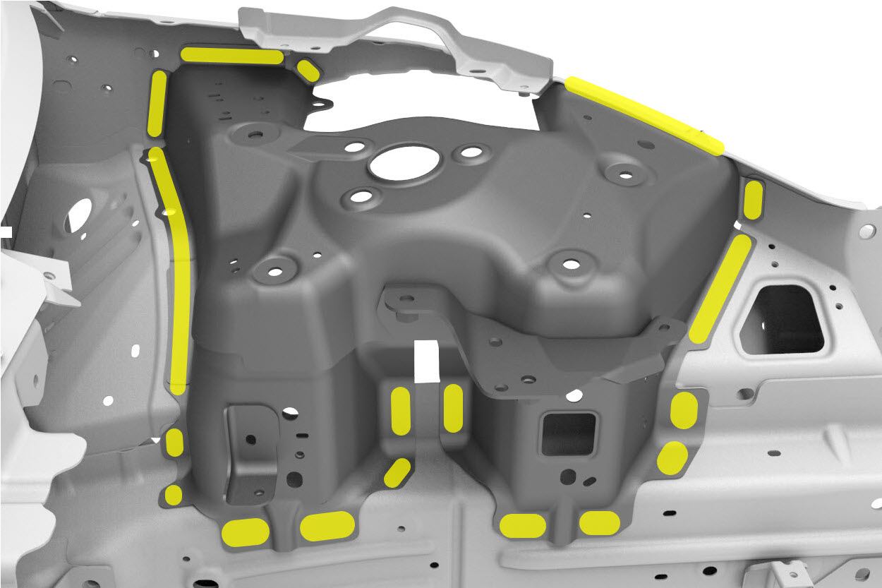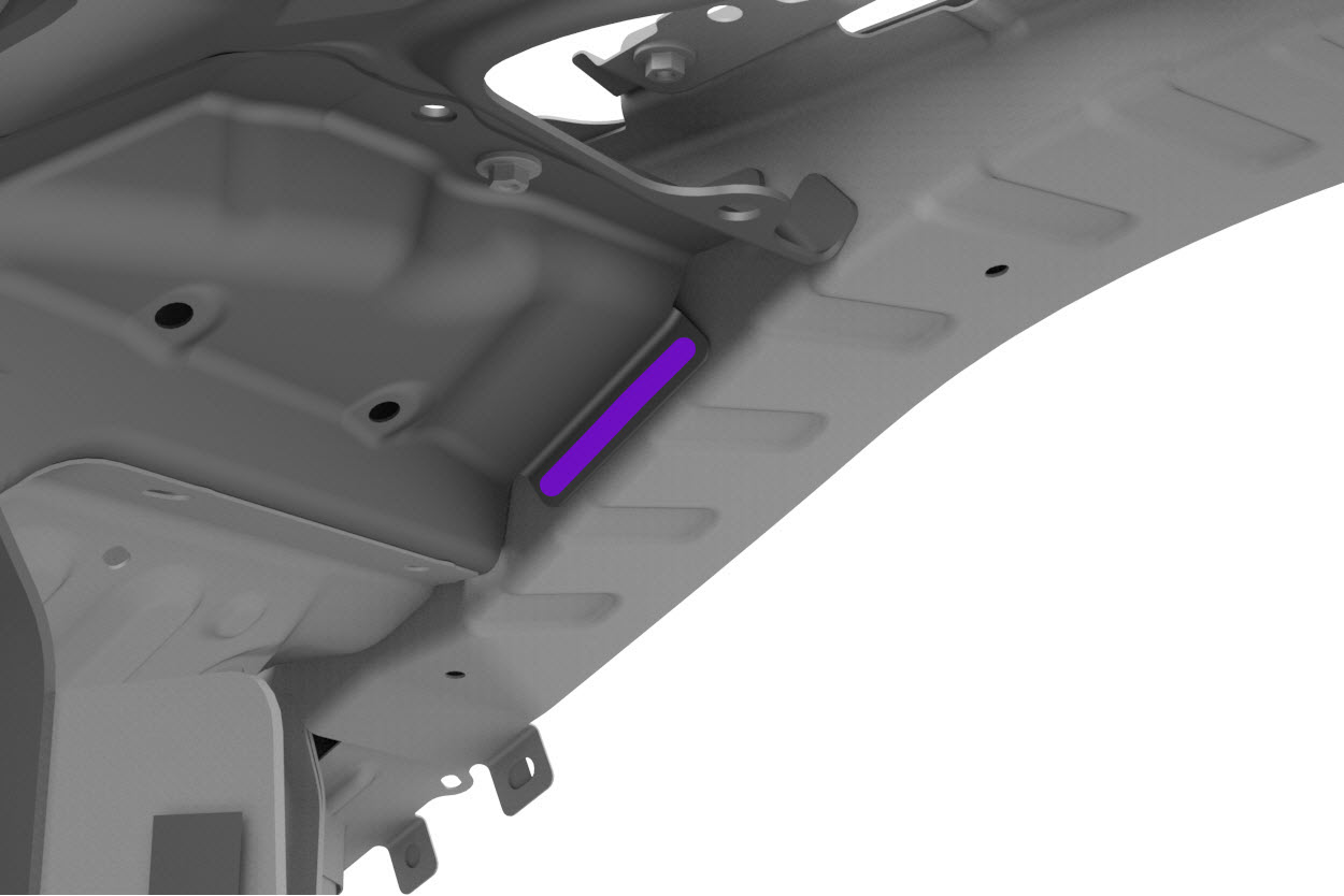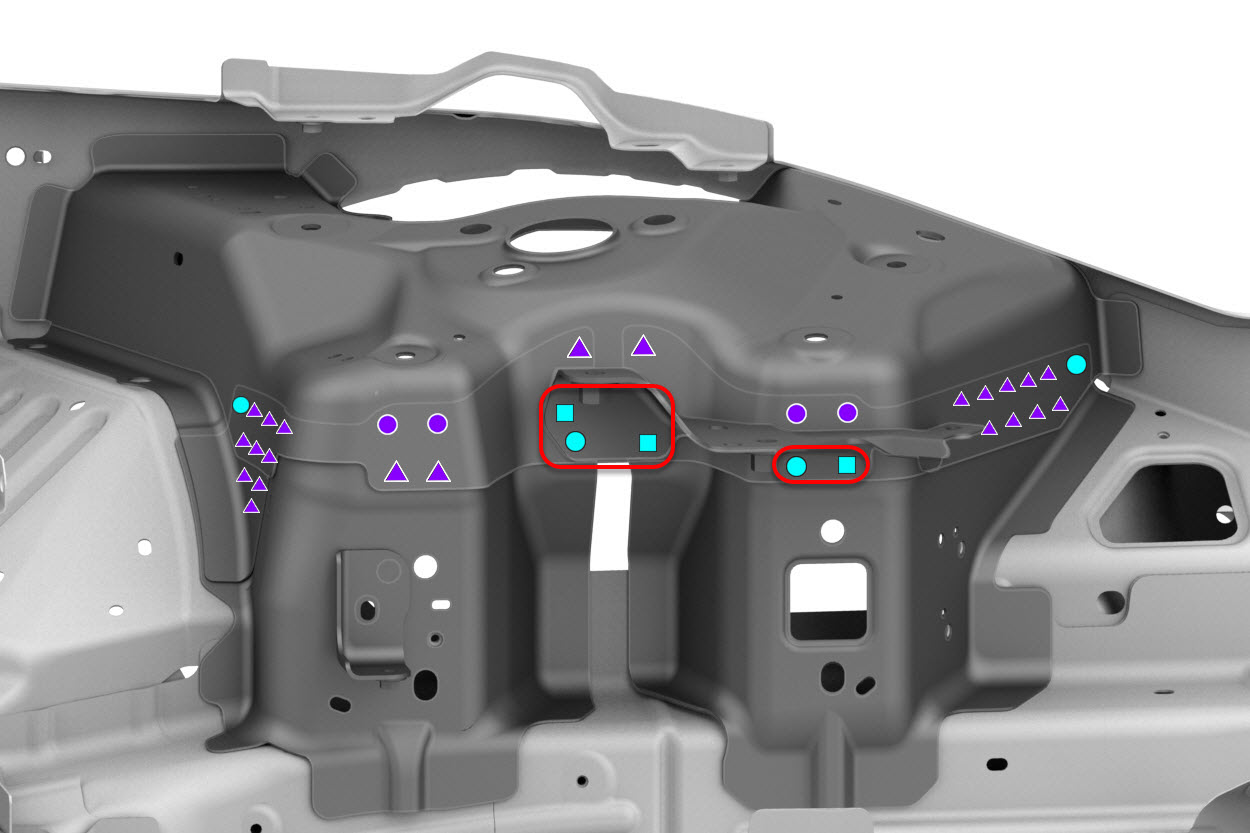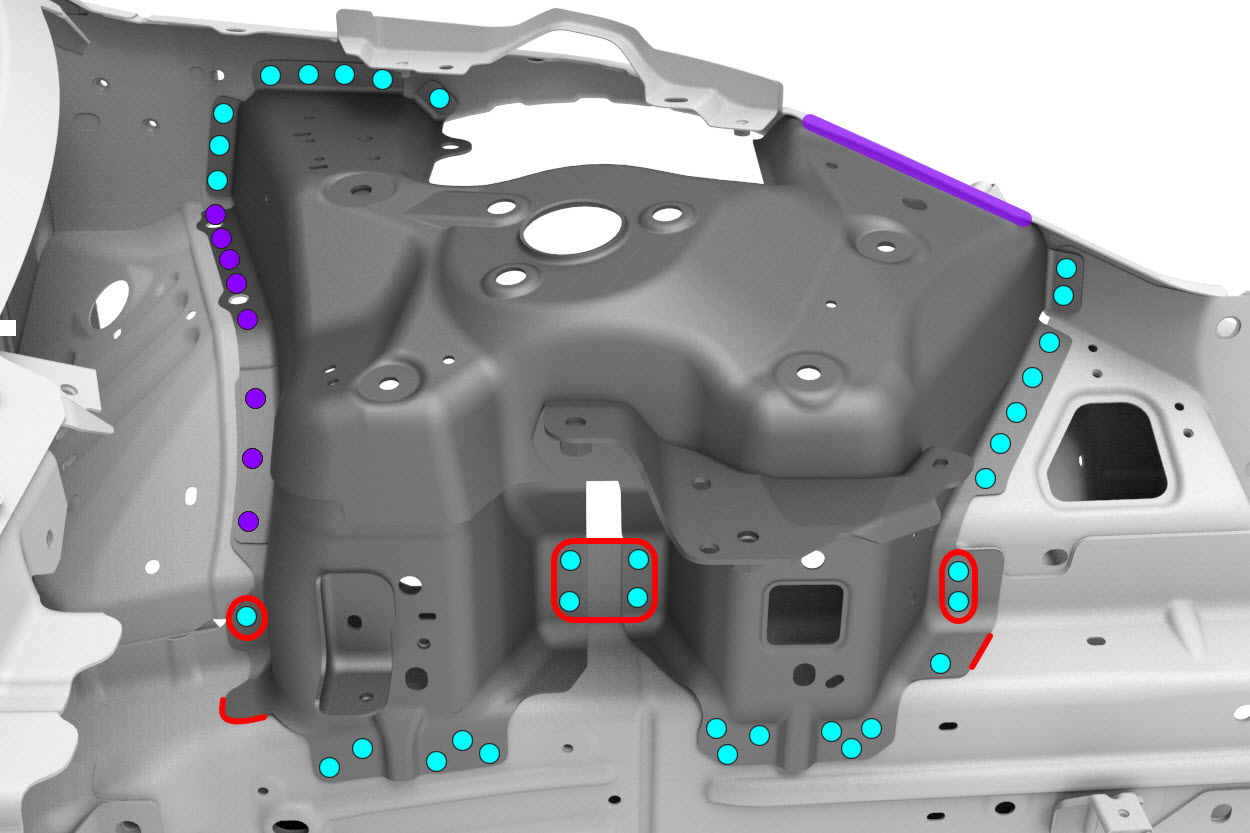 NoteBolts circled in red are installed from the back side of the panel. - Mount to the frame bench and apply structural adhesive to the mating surfaces on the components that make up the Shock Tower.