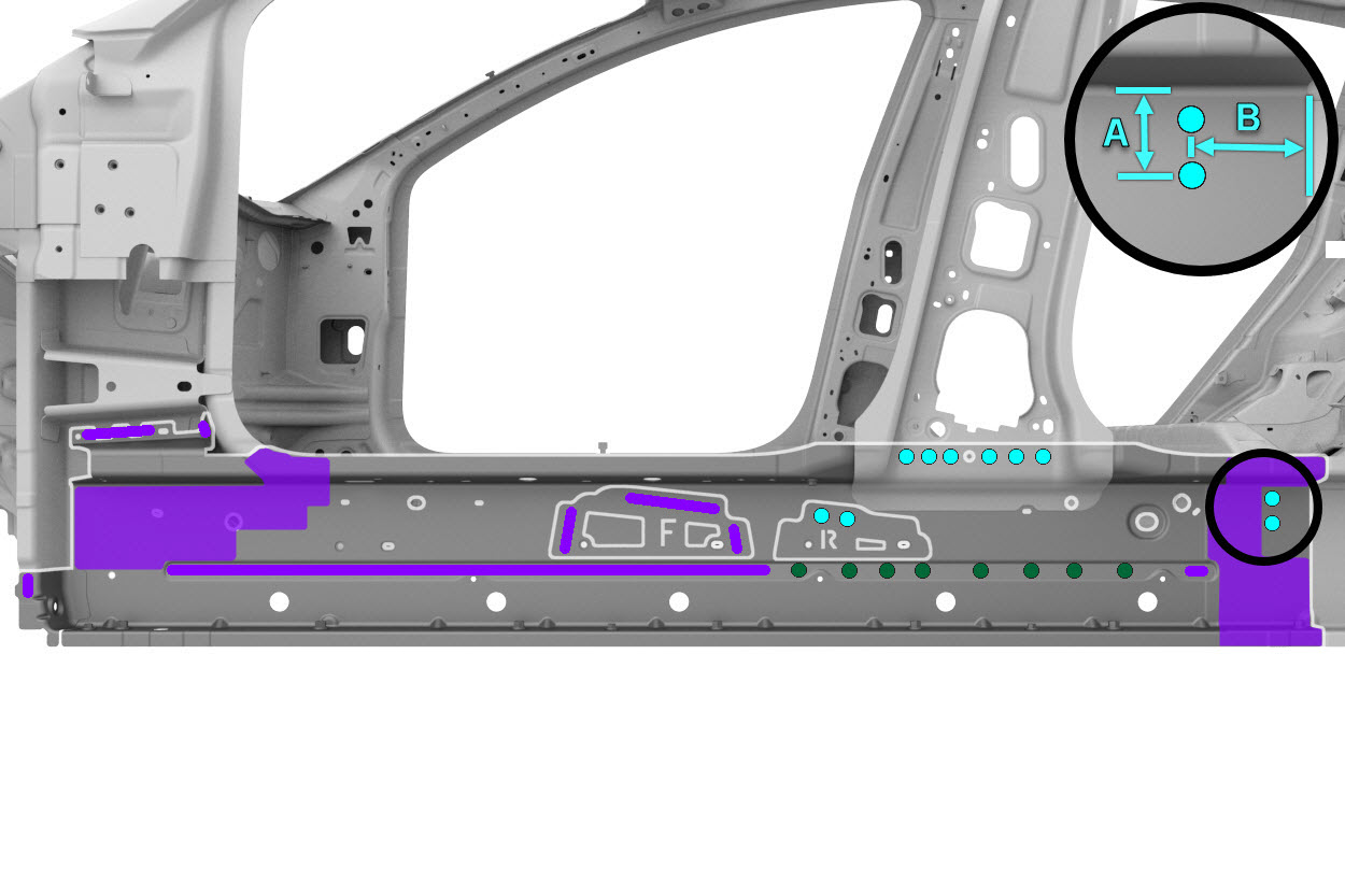 NoteAll countersunk rivets are installed from the back side of the Sill Inner. - Apply structural adhesive to the mating surfaces on the vehicle and the new component or components.