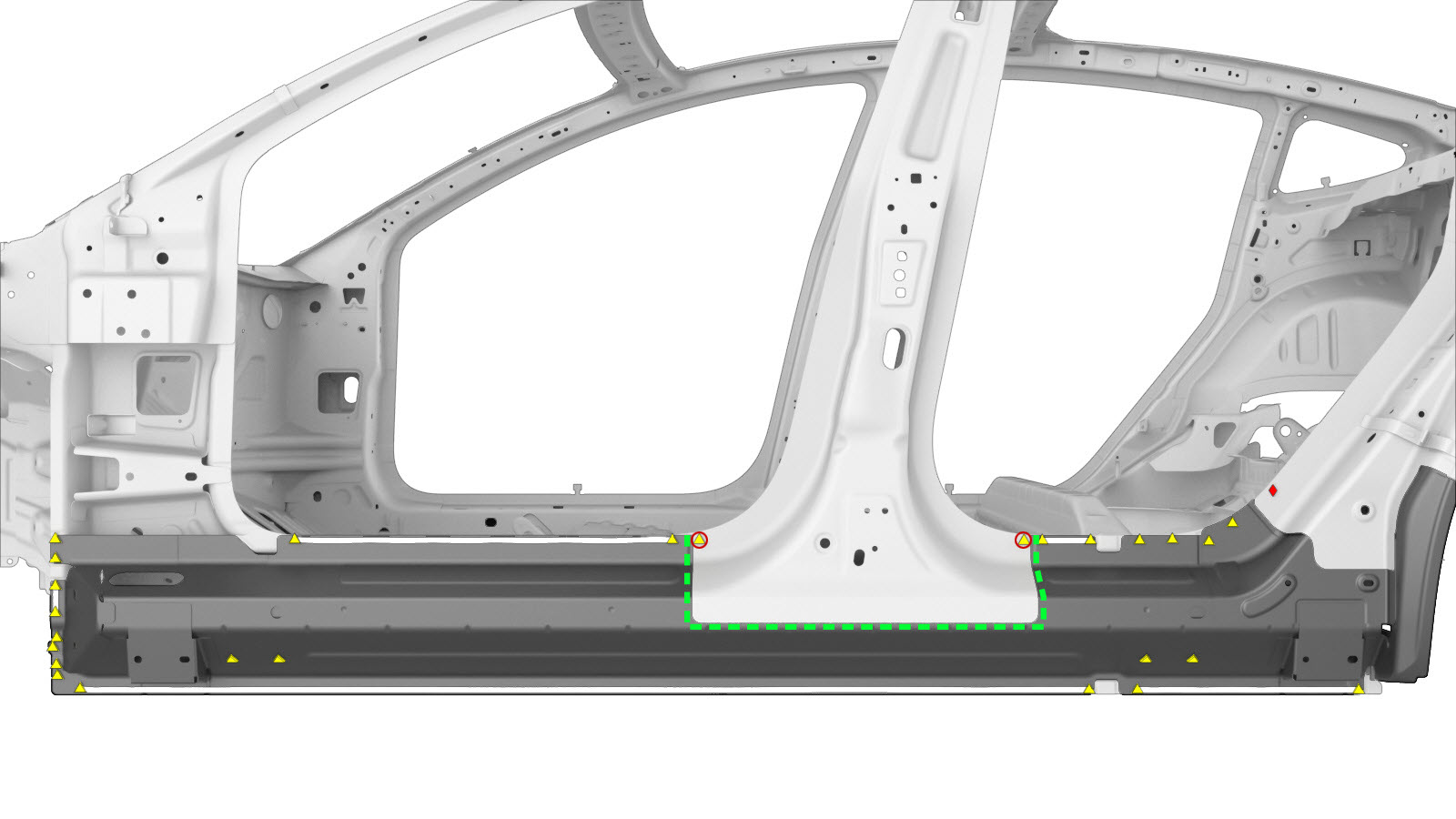 - From the back side of the Sill Outer, separate the spot welds at the bottom flange of the B–Pillar Outer (the area circled in red).