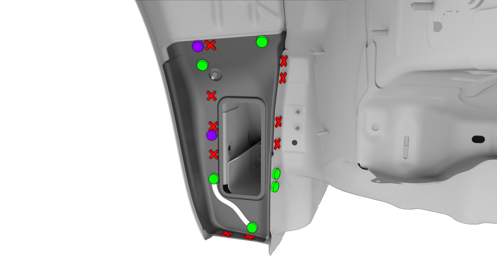 NoteA red X indicates a location where a factory-installed fastener is not being replaced.