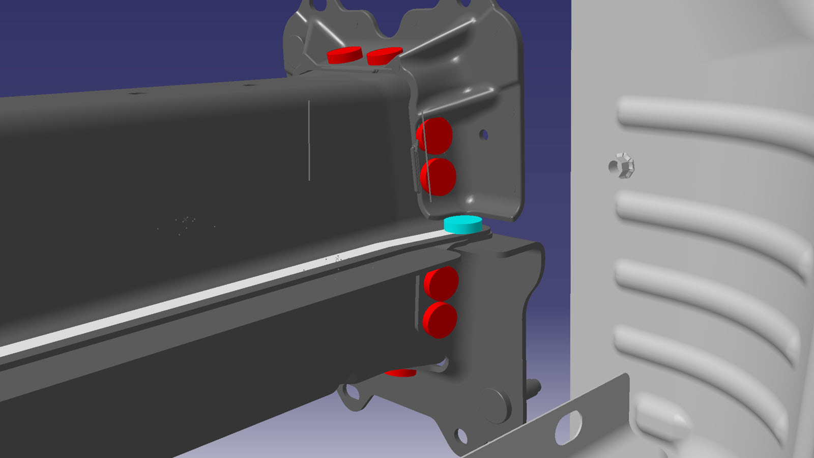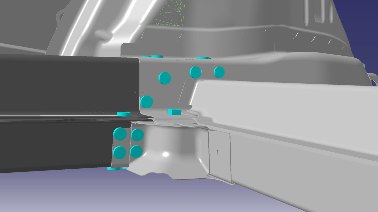 NotePut the new Rear Rail Lower Reinforcement into position and install the new bolts (Tesla part number 1008770-00-A) and nuts (Tesla part number 1016227-00-A), and torque them to 13 Nm.NoteWhen installing the Rear Rail Upper Assembly and the Rear Rail Lower Assembly, structural bulb rivets are installed in the flanges of both assemblies to secure them together. Install the structural bulb rivets in an alternating pattern: 1 from the Rear Rail Upper Assembly downward and then 1 from the Rear Rail Lower Assembly upward.NoteTemporarily install the new bolts and nuts in the holes not being used for frame bench fixture bolts, but do not torque them fully at this time.