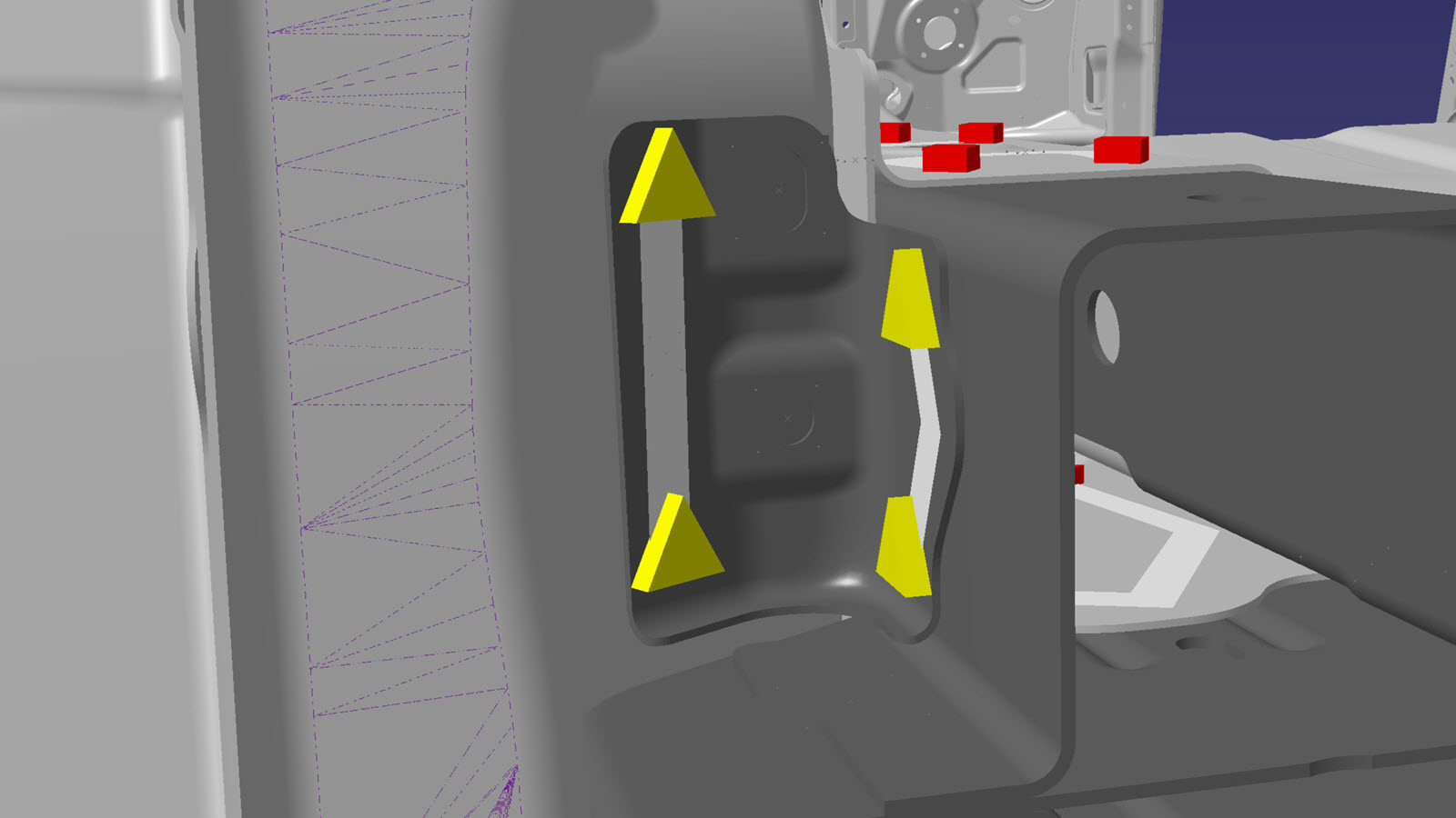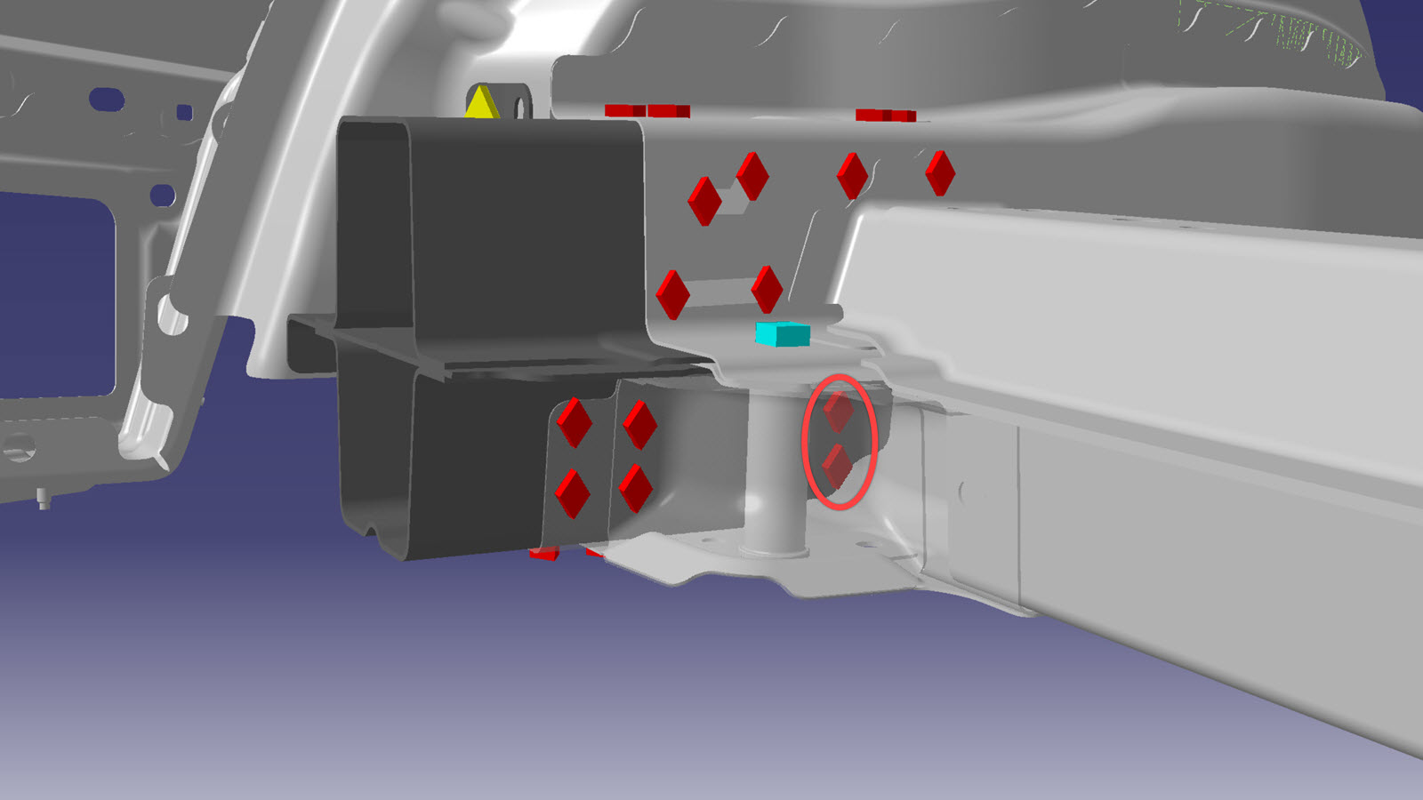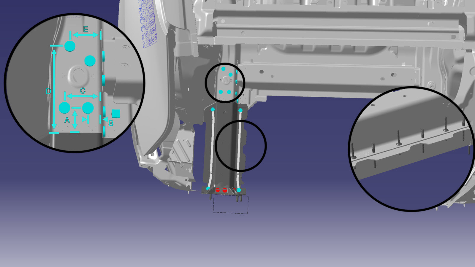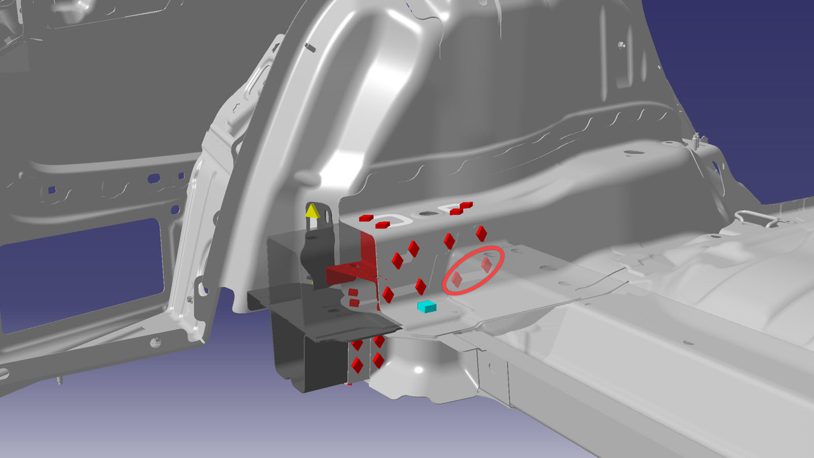 NoteThe Frame Rail Inner Reinforcement (highlighted in red) must be removed to allow access to other factory SPRs.NoteThe factory SPRs circled in red are hidden behind the crossmember and must be ground down from inside the Frame Rail using a belt sander. When grinding the SPRs, do not knock out the SPRs entirely from the joint in order to keep some mechanical connection to the inboard bulkhead. These rivets are not replaced when installing the new Rear Rail Upper. -