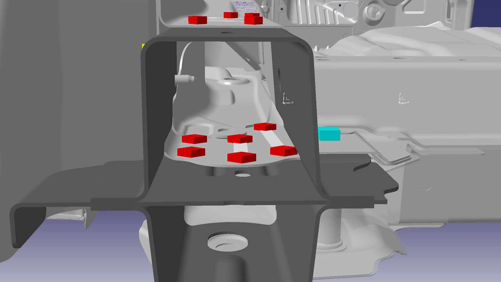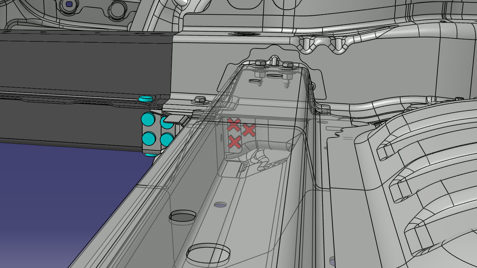 NoteUse the remaining portion of the original Rear Rail Lower Reinforcement (removed in an earlier step) as a template to mark holes for bolts in the new component.NoteA red X indicates a location where a factory-installed fastener is not being replaced.