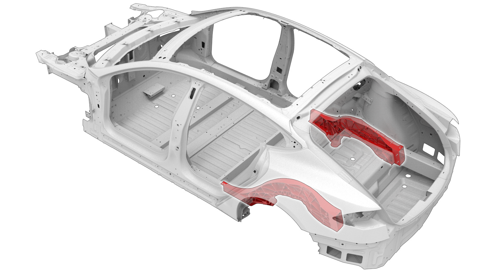 The images below show different views of the Rear Node, and contain highlighted areas (the images below use the LH Rear Node for reference, but repair areas on the RH component are similar). Compare the damaged area of the vehicle's Rear Node to the images below, then use the repair criteria corresponding to the color of the highlighted area to find the criteria to use to determine if the damaged area can be repaired.