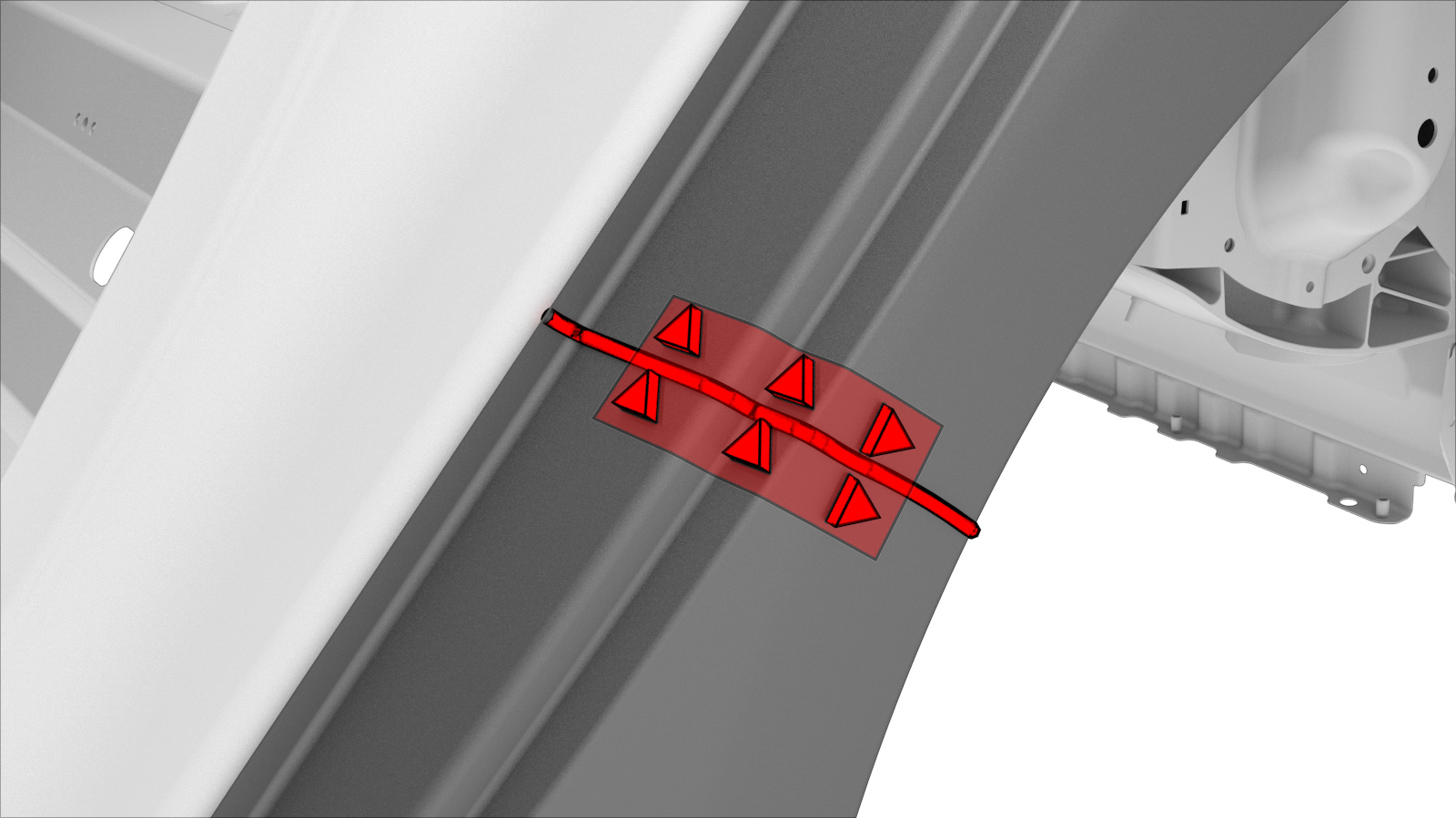 WarningFailure to follow all welding safety precautions, including the use of personal protective equipment, could result in serious injury or property damage. Only technicians who have completed Tesla’s approved welding training are authorized to weld structural components on Tesla vehicles.WarningTo maintain vehicle crash integrity, use only approved welding wire and an approved GMA welder to perform GMA welding on Tesla vehicles. Refer to Approved Gas Metal Arc (GMA) Welders and Welding Wire for information on approved GMA welders and welding wire.CAUTIONDo not weld on a Tesla vehicle before performing the Vehicle Electrical Isolation Procedure (refer to the vehicle-specific Service Manual for more information on the Vehicle Electrical Isolation Procedure). Welding on a Tesla vehicle with an energized high or low voltage system might damage vehicle components.NoteBefore GMA welding, a test weld using material of the same gauge and type should be performed to make sure that the welding equipment settings produce a satisfactory joint. - Fold over the wheel arch flange.