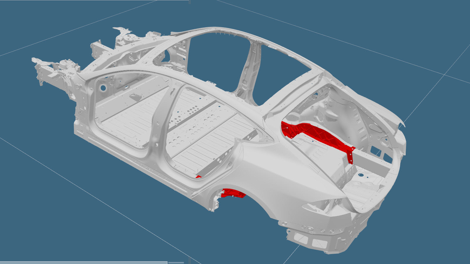 The images below show different views of the Rear Node, and contain highlighted areas (the images below use the LH Rear Node for reference, but repair areas on the RH component are similar). Compare the damaged area of the vehicle's Rear Node to the images below, then use the repair criteria corresponding to the color of the highlighted area to find the criteria to use to determine if the damaged area can be repaired.