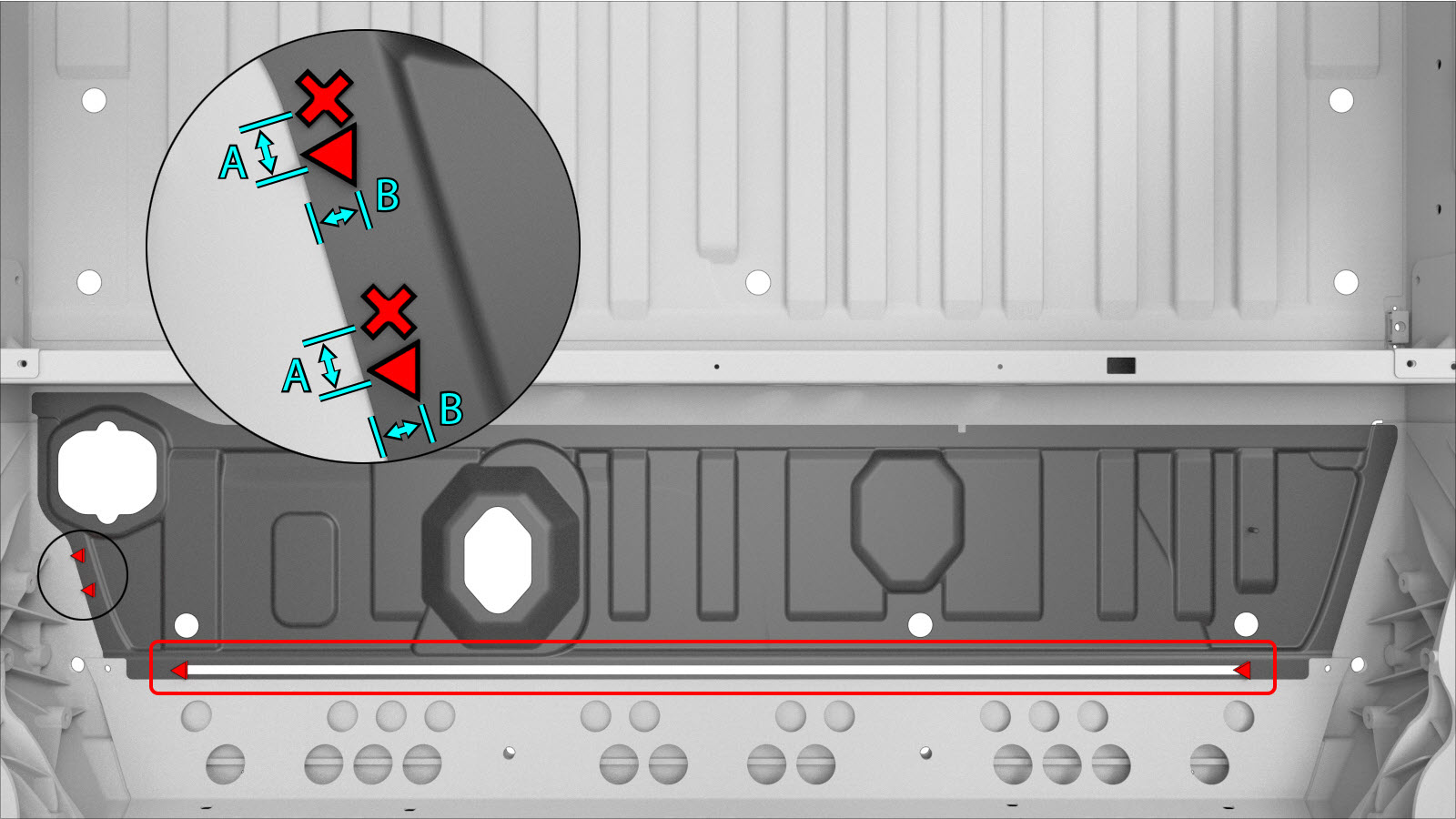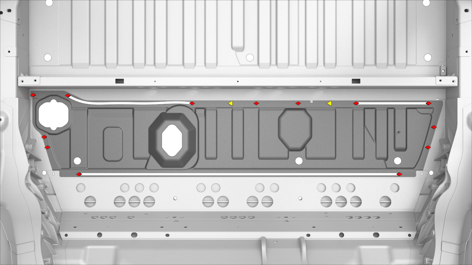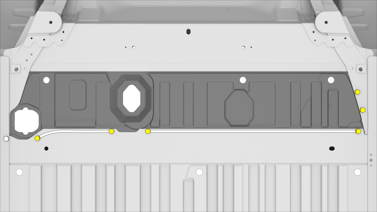 NoteAluminum plug welds are now used to install the floor panel instead of SPRs, so the holes previously used for SPRs must be sealed.