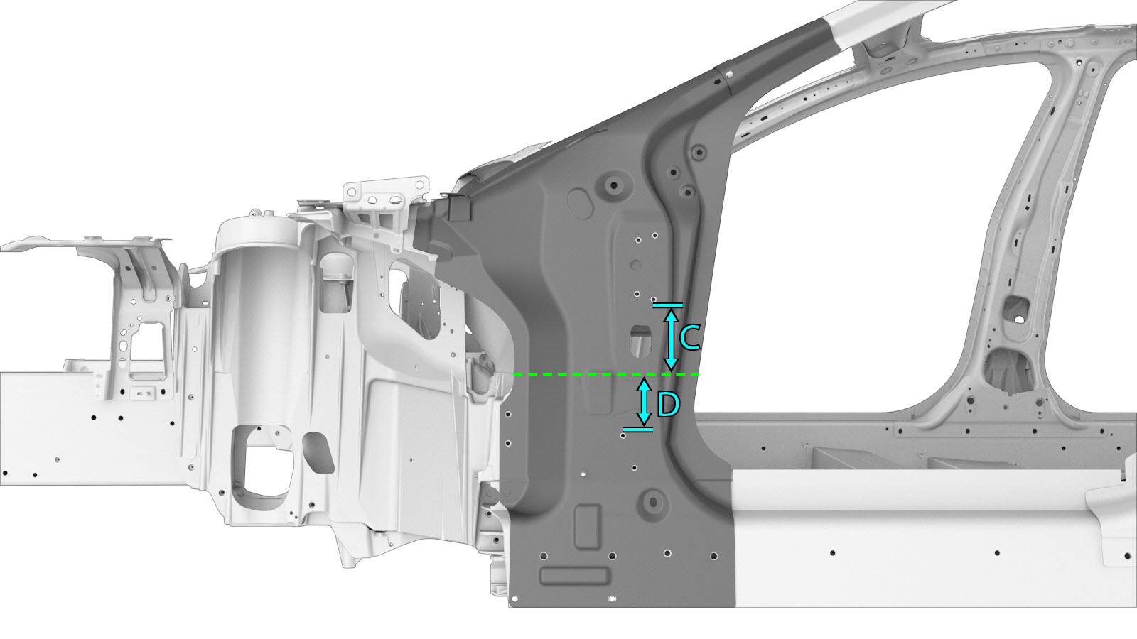 Alternatively, instead of replacing the complete Hinge Pillar Assembly, the upper or lower areas of the Hinge Pillar Assembly can be replaced using portions of a new Hinge Pillar Assembly component using the cut lines described in this document. |