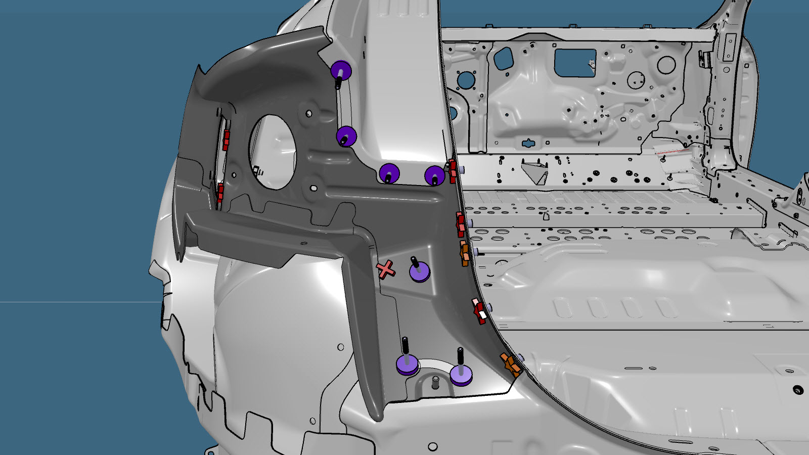 NoteA red X indicates a location where a factory-installed fastener is not being replaced.