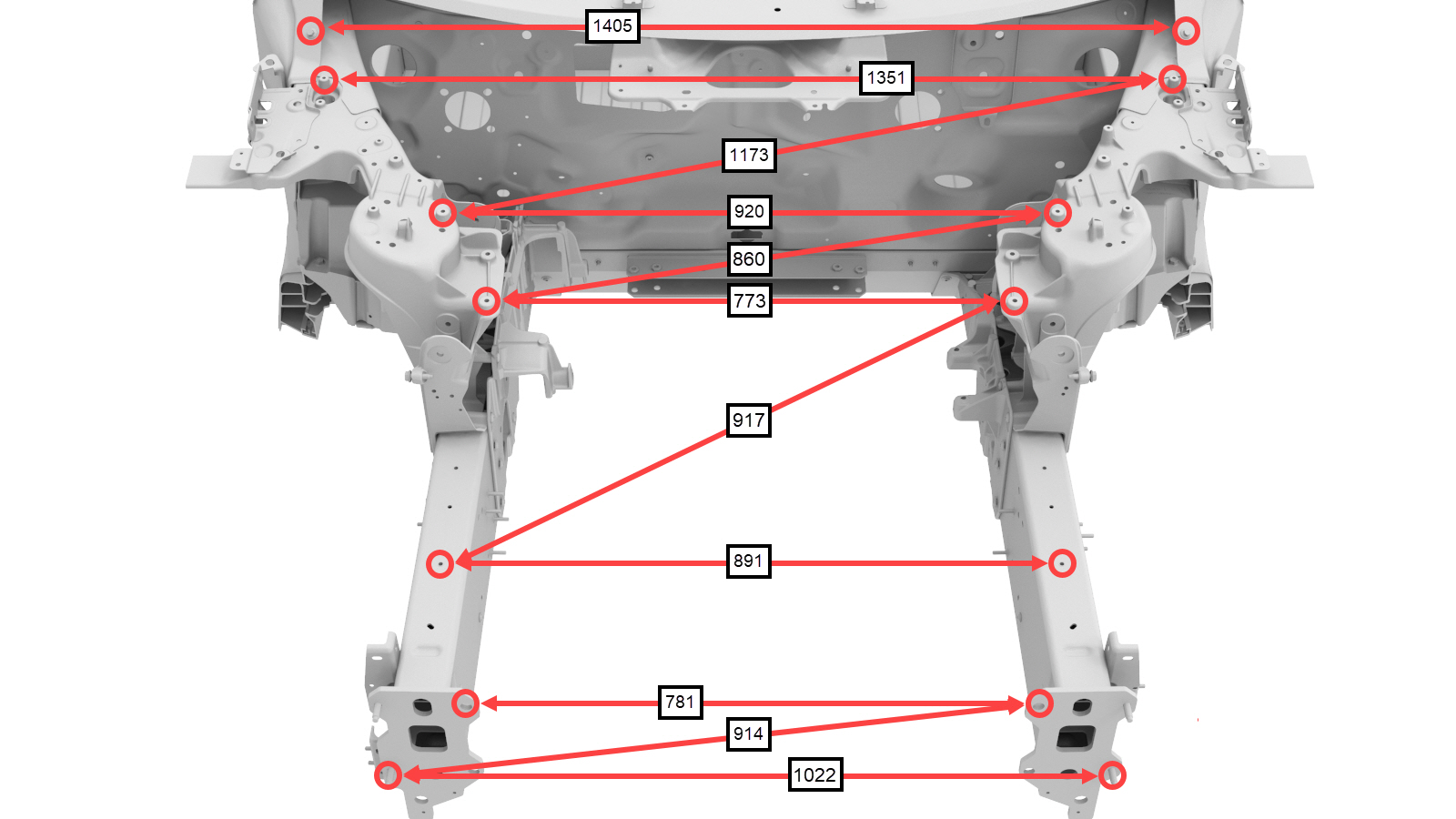 Dimensional measurements are used as an aid for diagnosing vehicle damage and determining if structural repairs might be necessary to return the vehicle to specification.