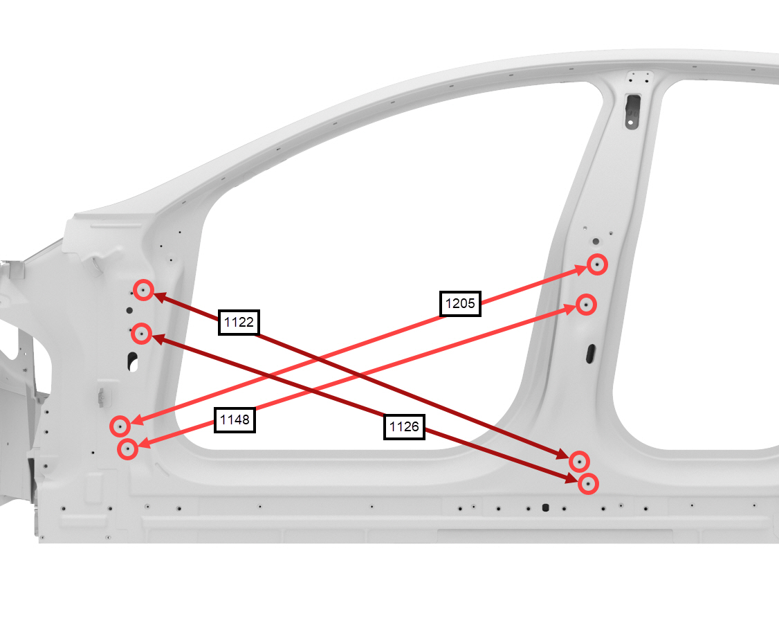 Lists the dimensions between known points on the vehicle for use in diagnosing vehicle damage.