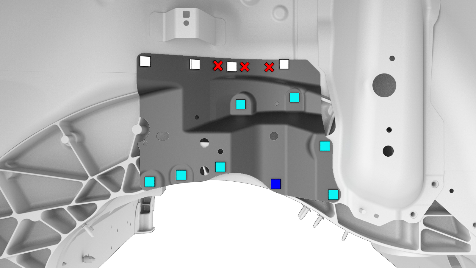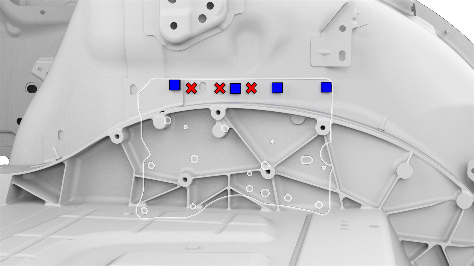 NoteA red X indicates a location where a factory-installed fastener is not being replaced.