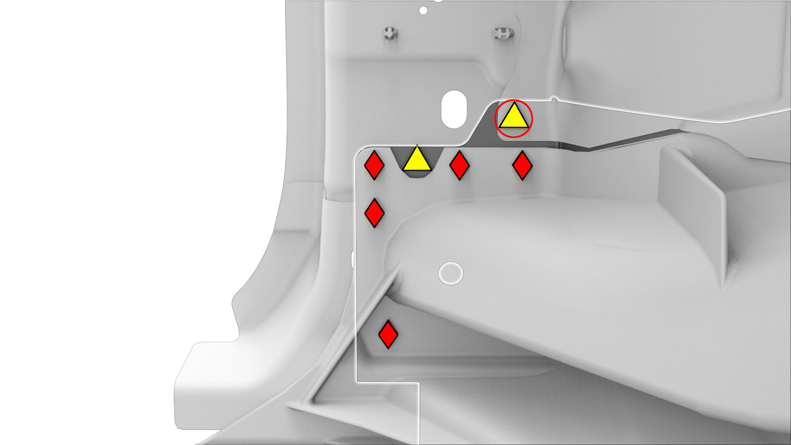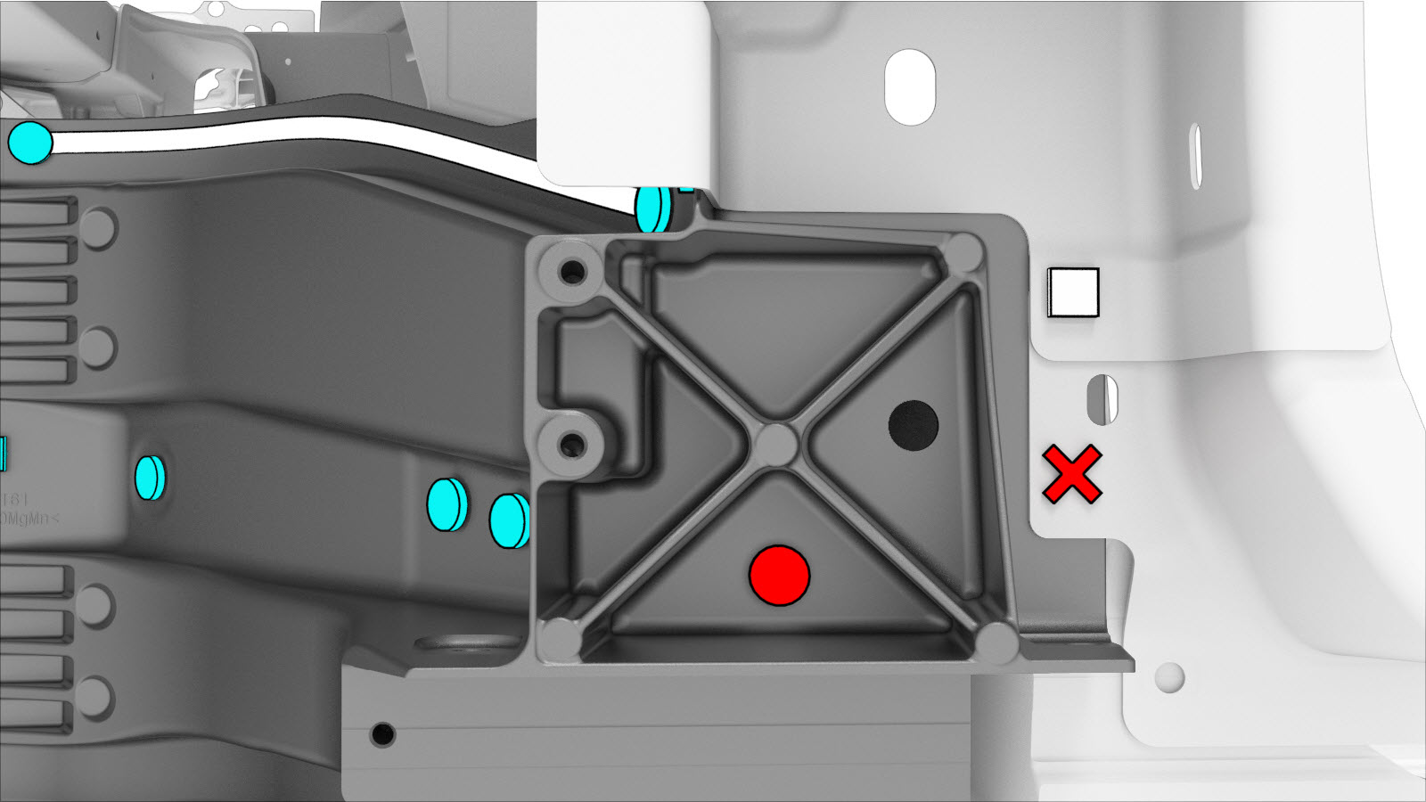 NoteA red X indicates a location where a factory-installed fastener is not being replaced.