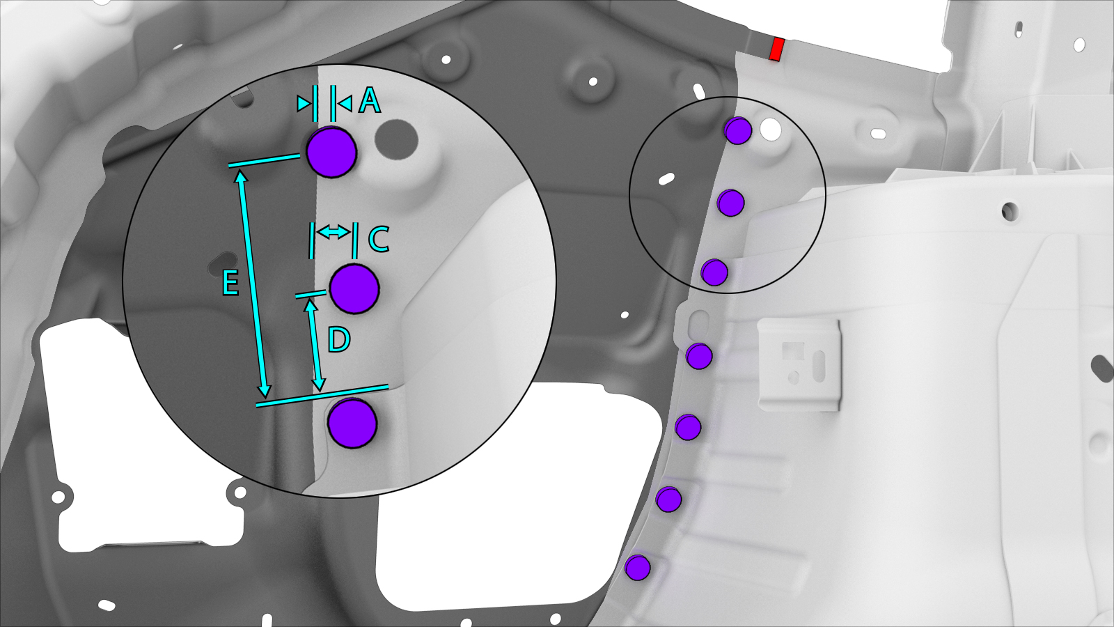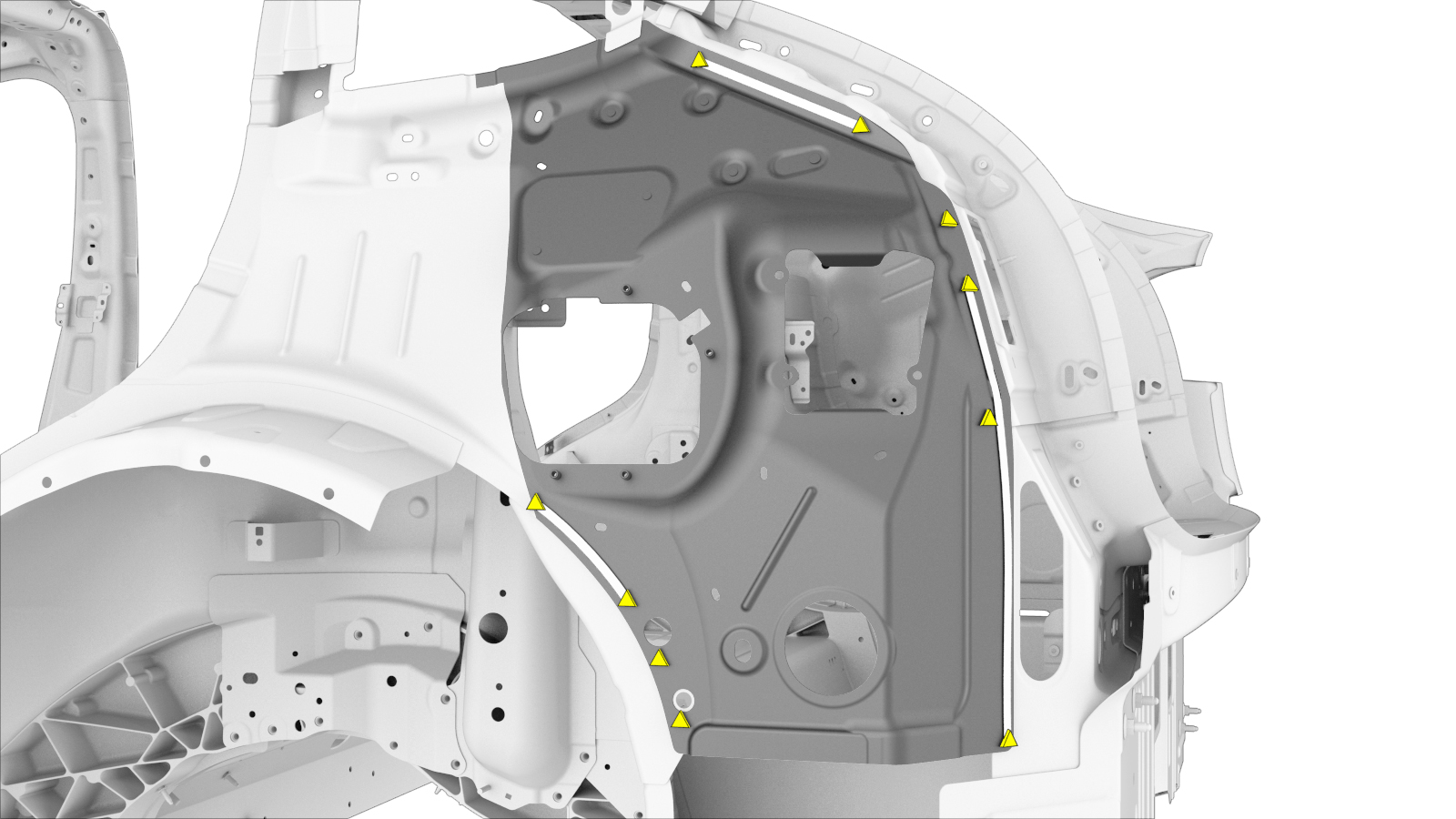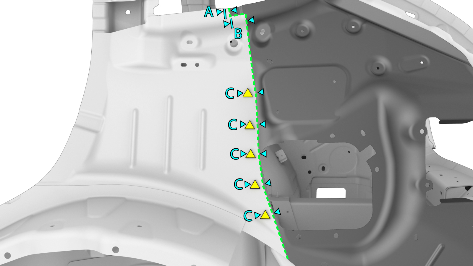 WarningFailure to follow all welding safety precautions, including the use of personal protective equipment, could result in serious injury or property damage. Only technicians who have completed Tesla’s approved welding training are authorized to weld structural components on Tesla vehicles.WarningTo maintain vehicle crash integrity, use only approved welding wire and an approved GMA welder to perform GMA welding on Tesla vehicles. Refer to Approved Gas Metal Arc (GMA) Welders and Welding Wire for information on approved GMA welders and welding wire.CAUTIONDo not weld on a Tesla vehicle before performing the Vehicle Electrical Isolation Procedure (refer to the vehicle-specific Service Manual for more information on the Vehicle Electrical Isolation Procedure). Welding on a Tesla vehicle with an energized high or low voltage system might damage vehicle components.NoteBefore GMA welding, a test weld using material of the same gauge and type should be performed to make sure that the welding equipment settings produce a satisfactory joint. - Install the necessary portion of the Rear Wheel Arch.