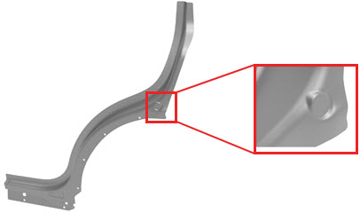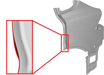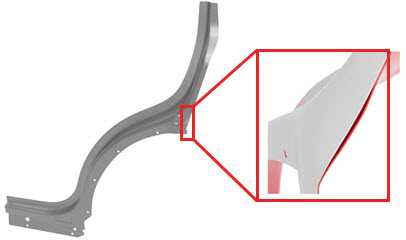 The profile of the flange at the top of the wheel arch has changed. The expanded area of the image below shows the previous Rear Quarter Outer (in gray) placed over the new Rear Quarter Outer (in red).
