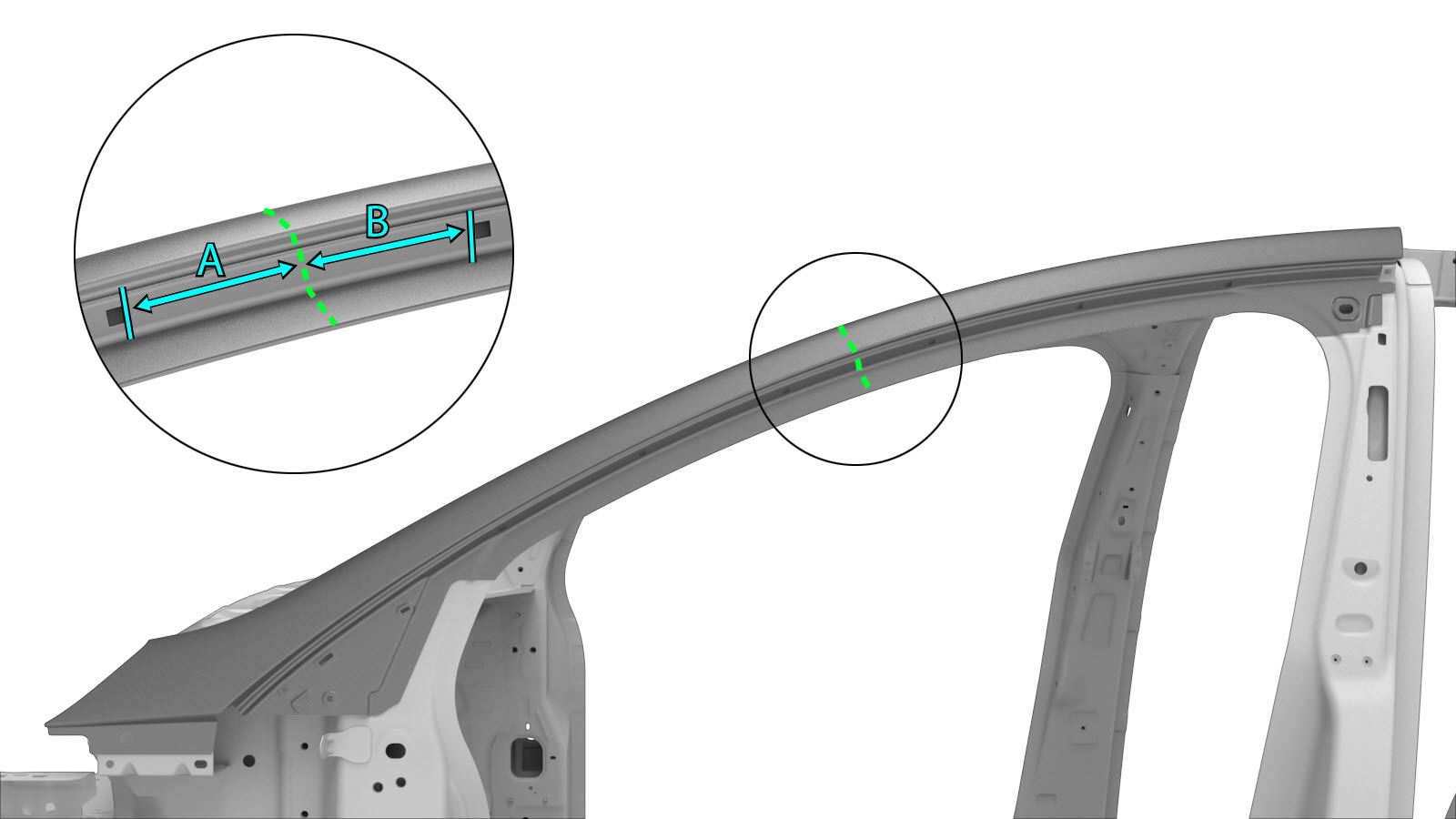 - If replacing a section of the A–Pillar Outer: Mark the cut line as described in A–Pillar Outer Section Descriptions.