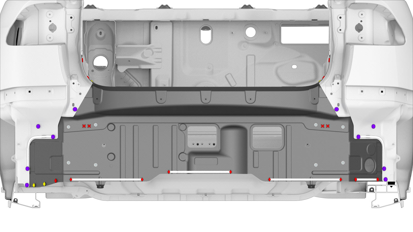 NoteA red X indicates a location where a factory-installed fastener is not being replaced.