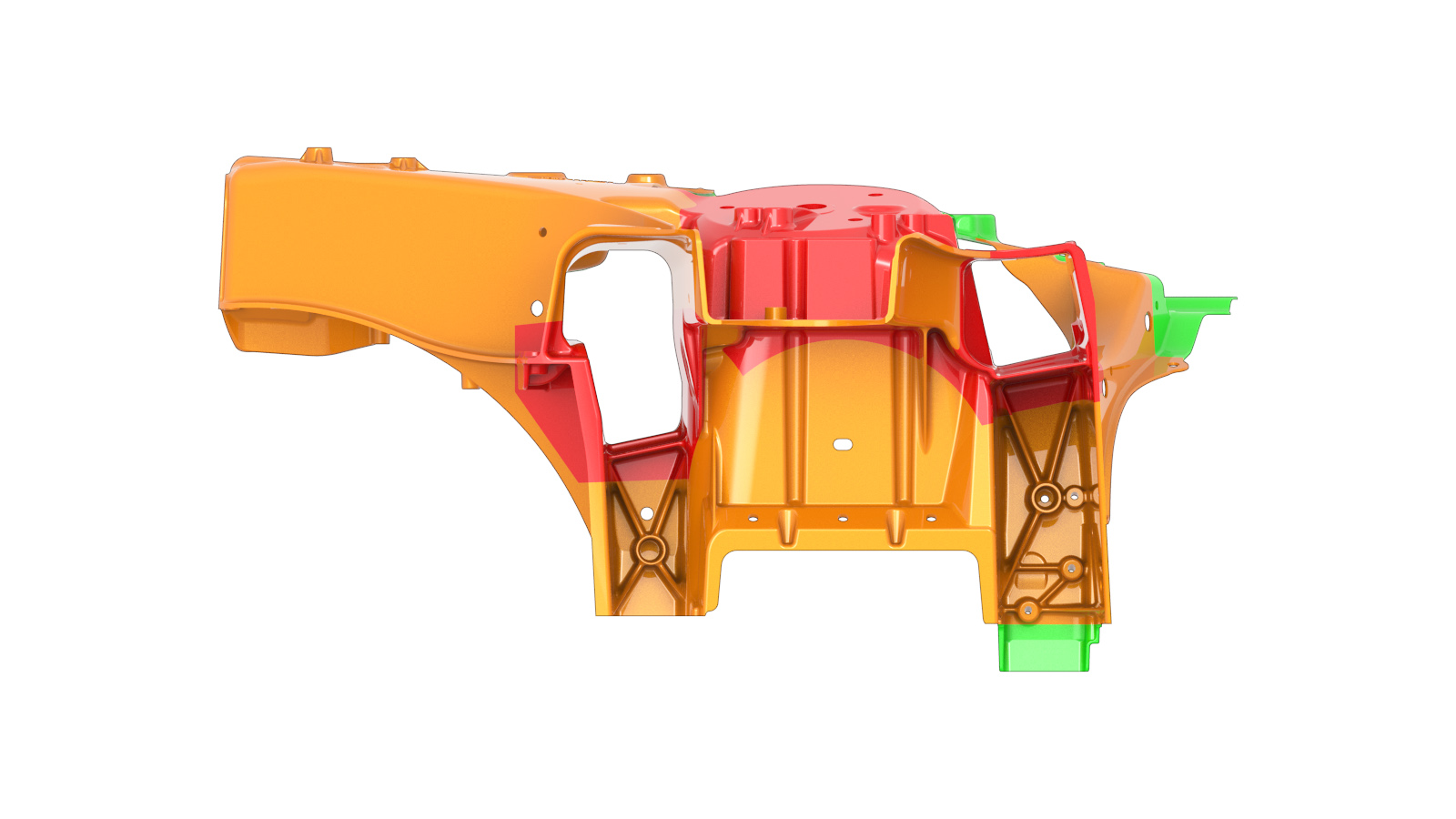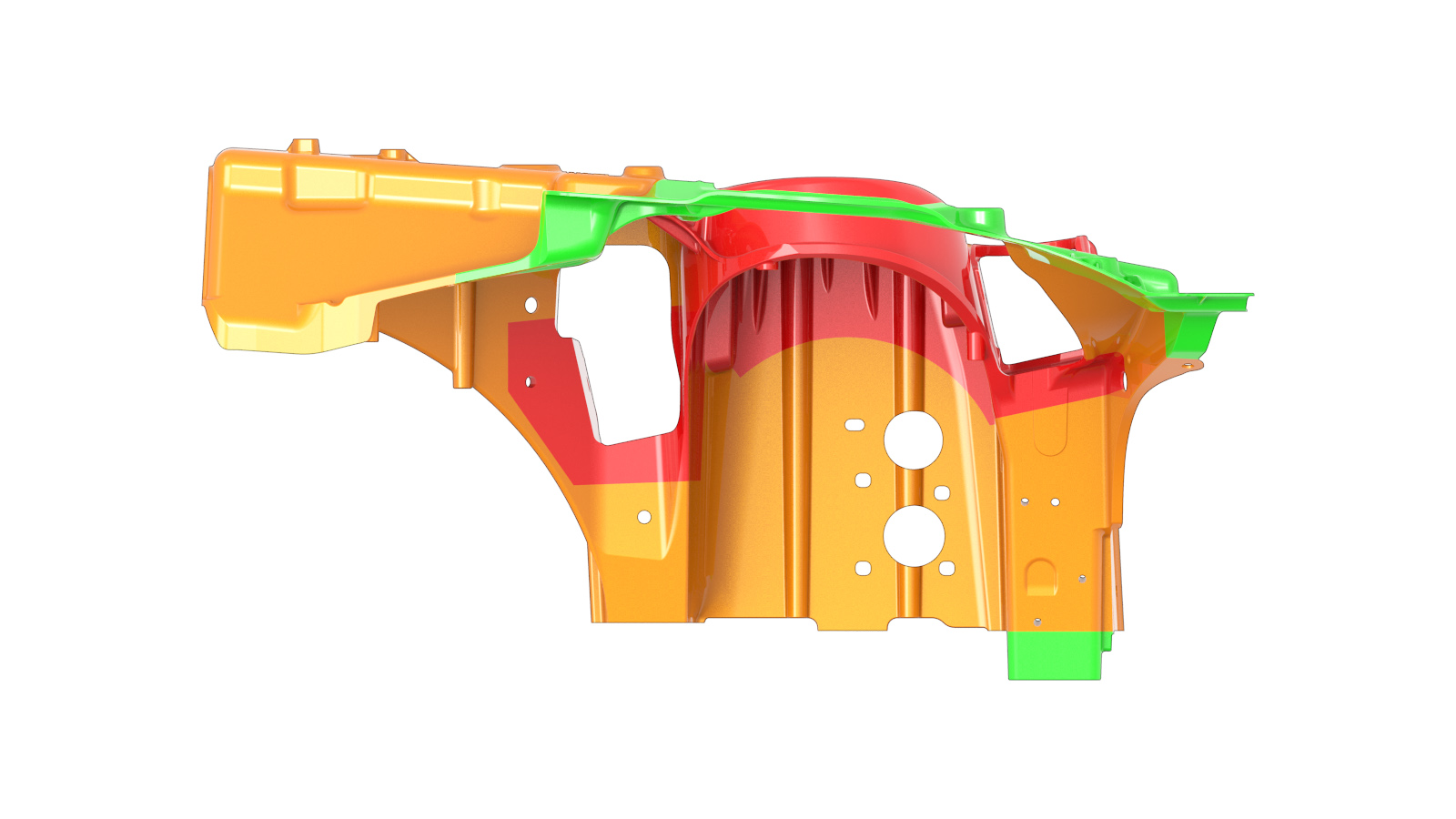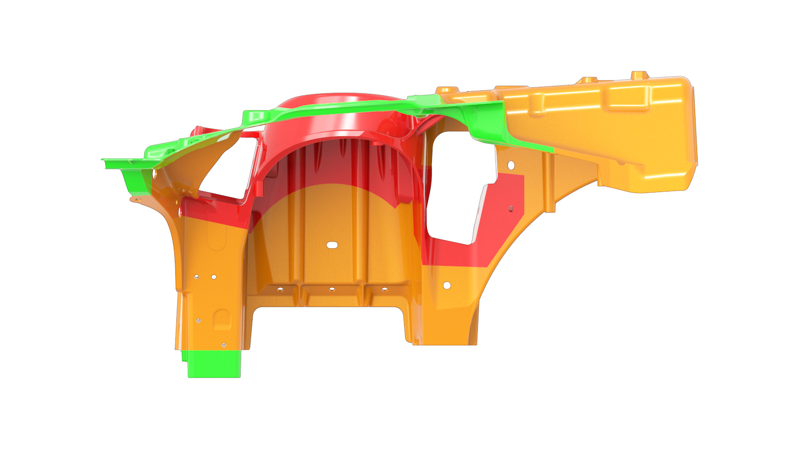 The images below show the Shock Tower from different angles, and contain highlighted areas. Compare the damaged area of the vehicle's Shock Tower to the images below, then use the repair criteria corresponding to the color of the highlighted area to find the criteria to use to determine if the damaged area of the component can be repaired.