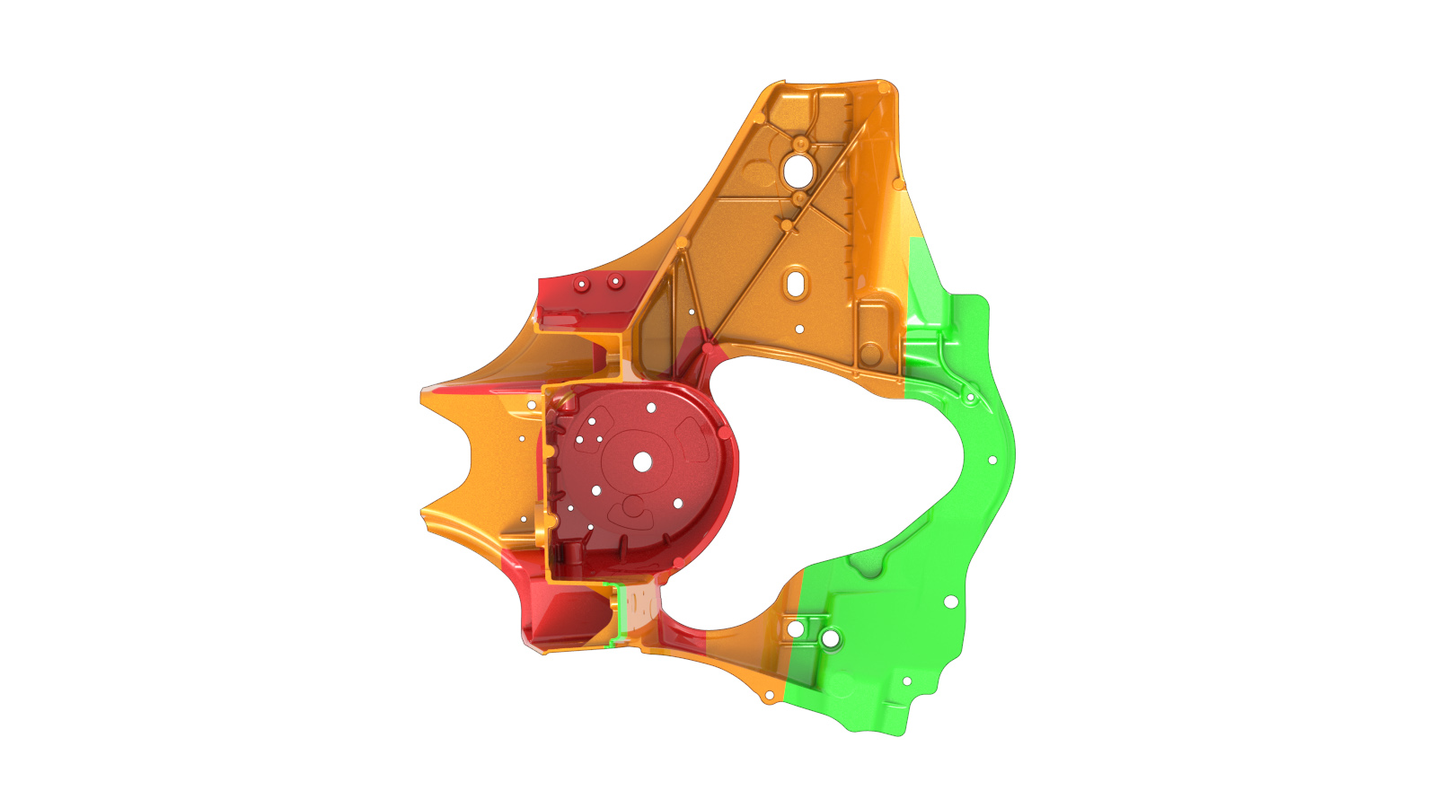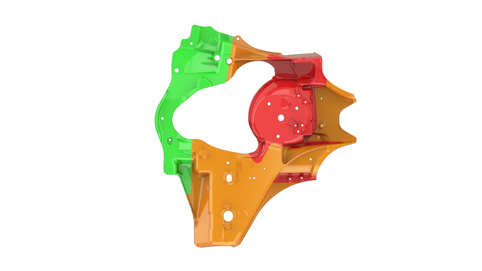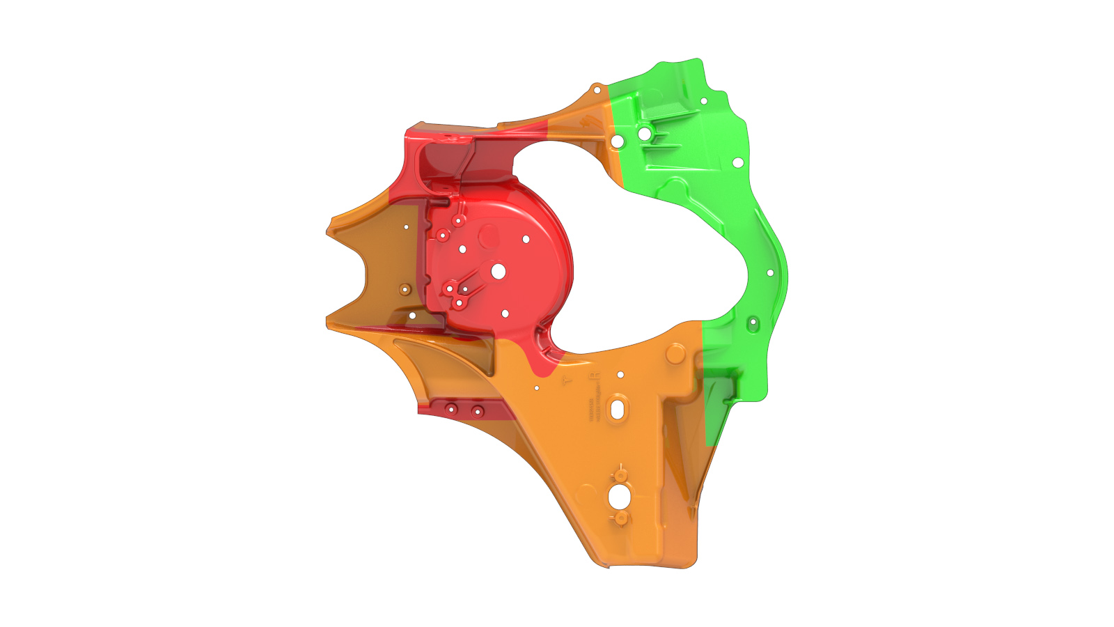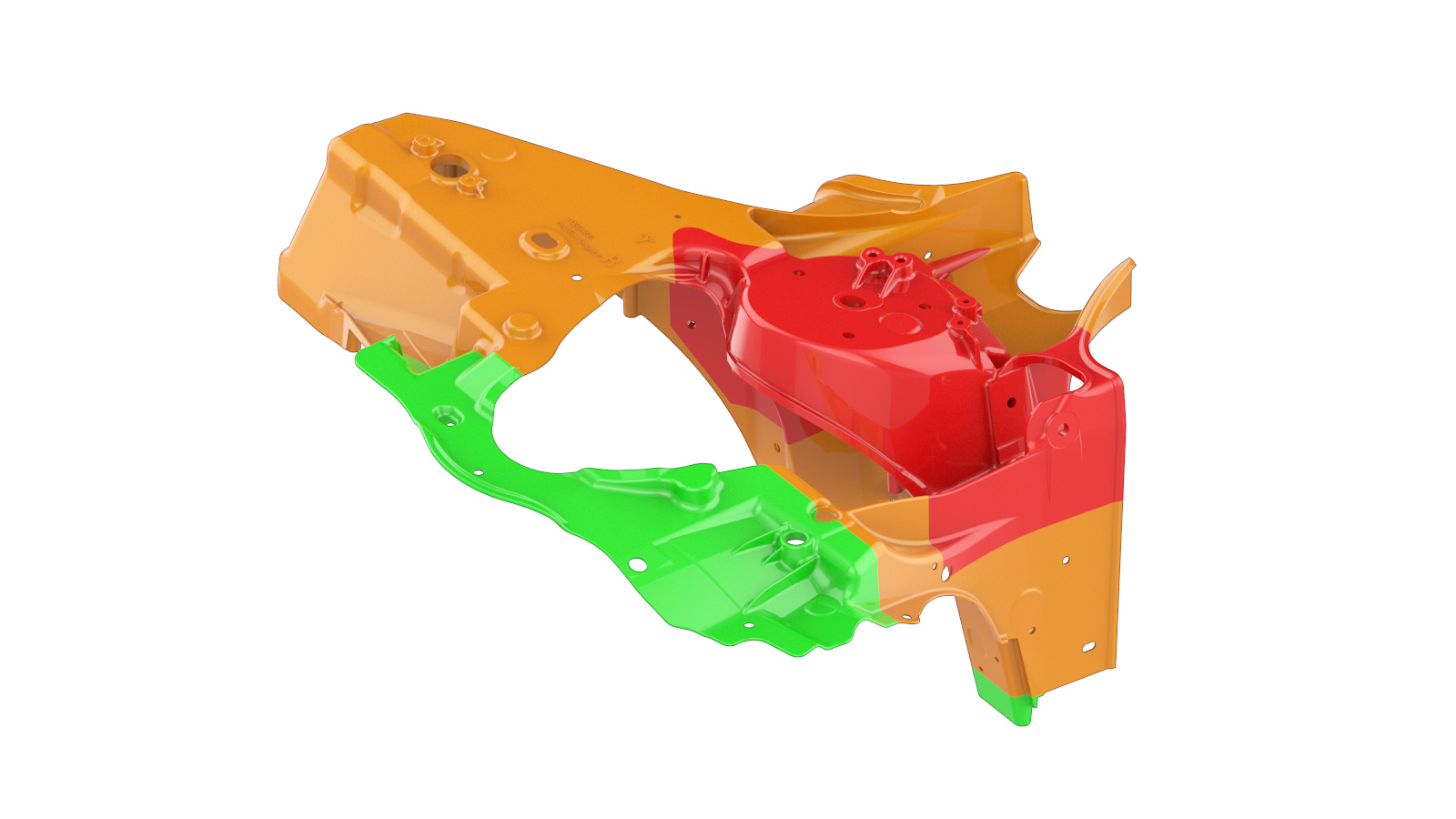 The images below show the Shock Tower from different angles, and contain highlighted areas. Compare the damaged area of the vehicle's Shock Tower to the images below, then use the repair criteria corresponding to the color of the highlighted area to find the criteria to use to determine if the damaged area of the component can be repaired.