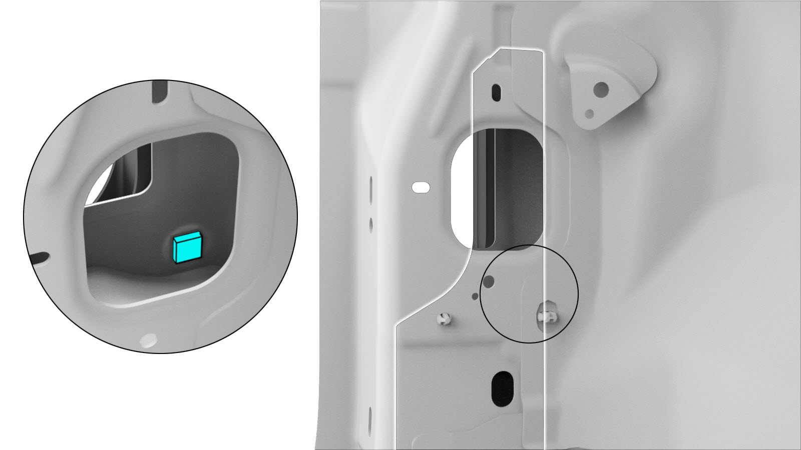 - Remove the Rivnut from the Hinge Pillar Reinforcement service part.