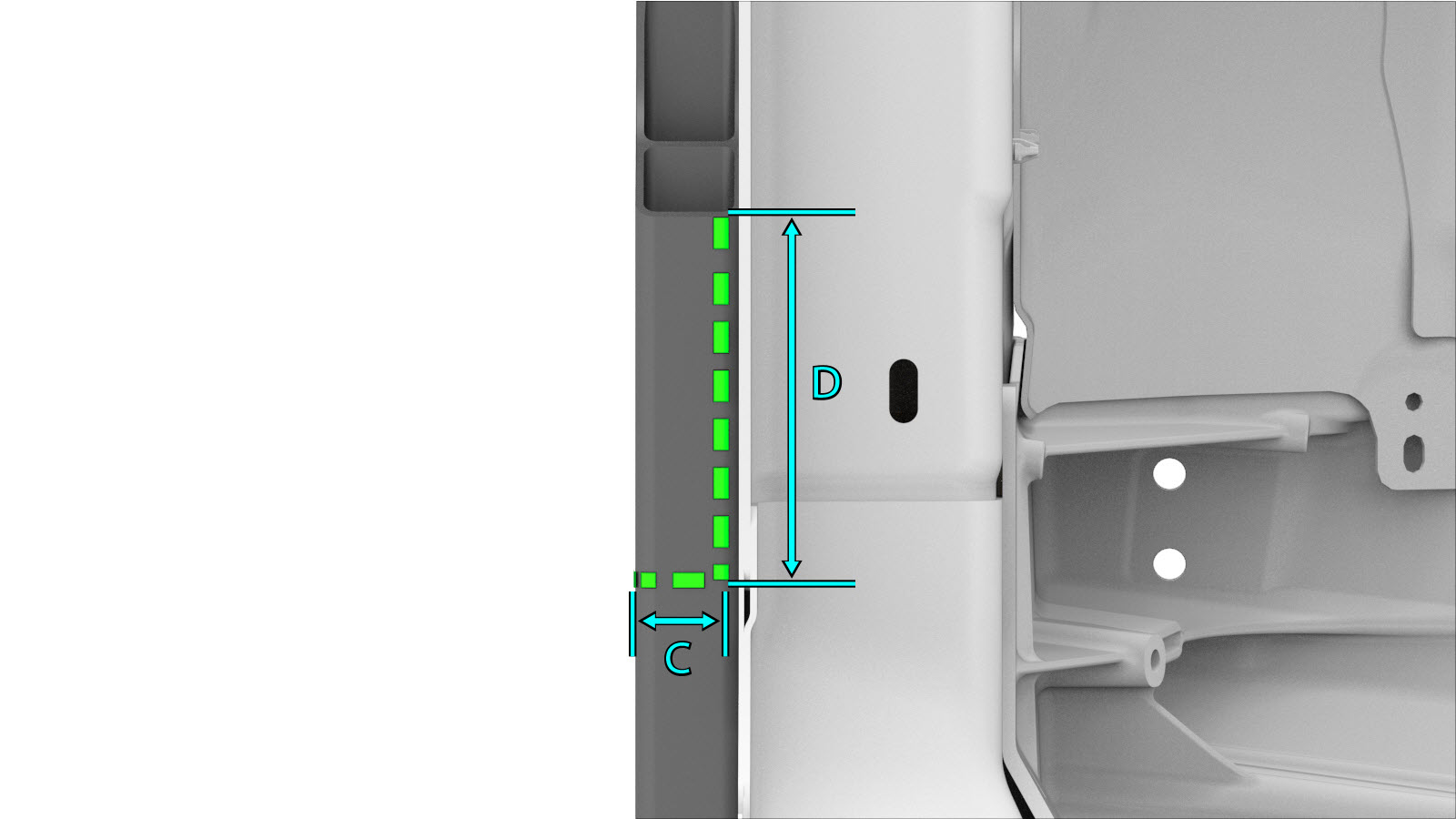 - Drill a 20 mm. hole in the Hinge Pillar Reinforcement service part in the indicated location.
