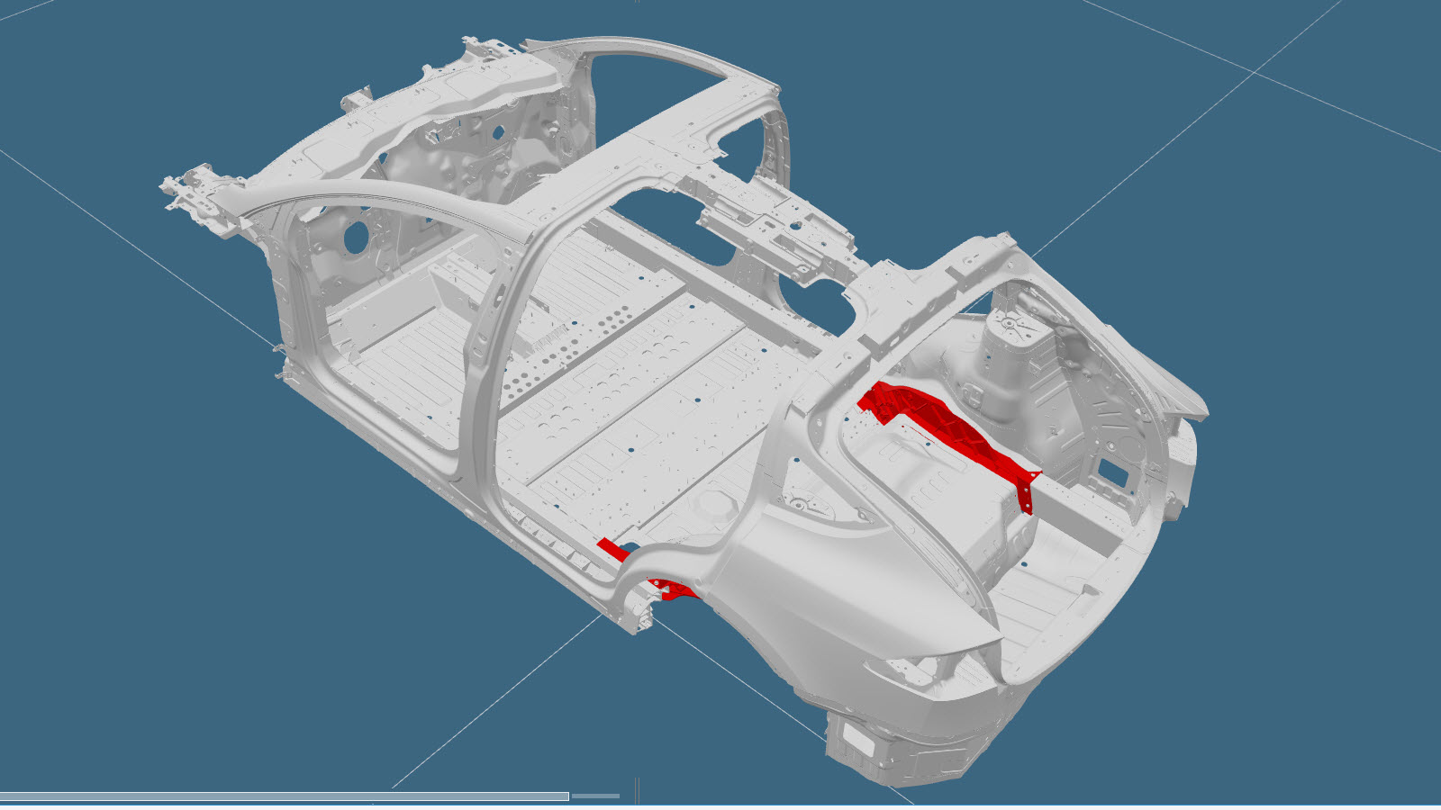 The images below show different views of the Rear Node, and contain highlighted areas (the images below use the LH Rear Node for reference, but repair areas on the RH component are similar). Compare the damaged area of the vehicle's Rear Node to the images below, then use the repair criteria corresponding to the color of the highlighted area to find the criteria to use to determine if the damaged area can be repaired.