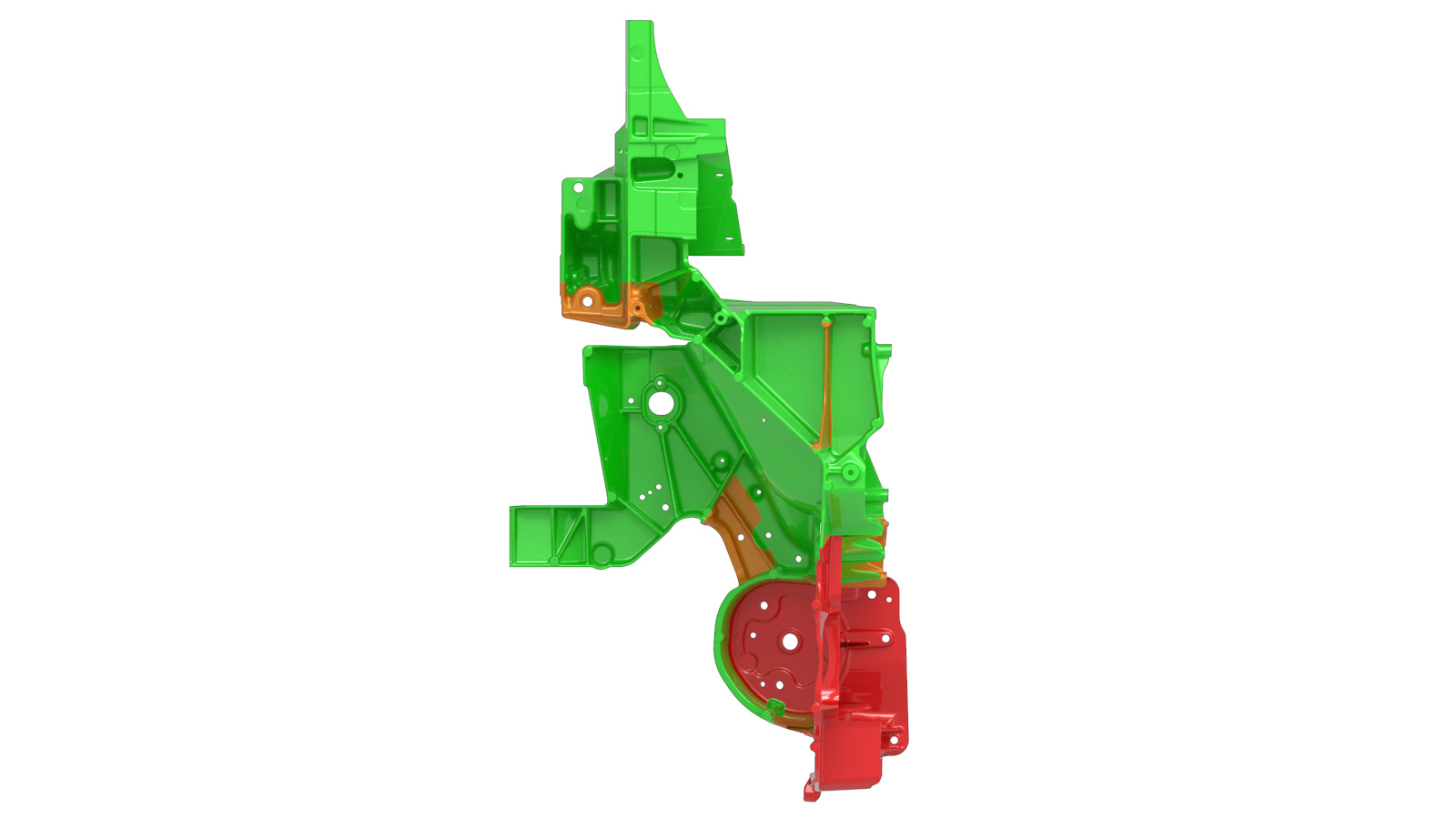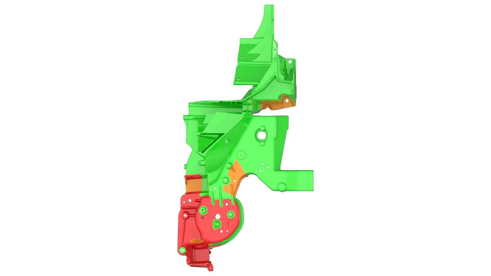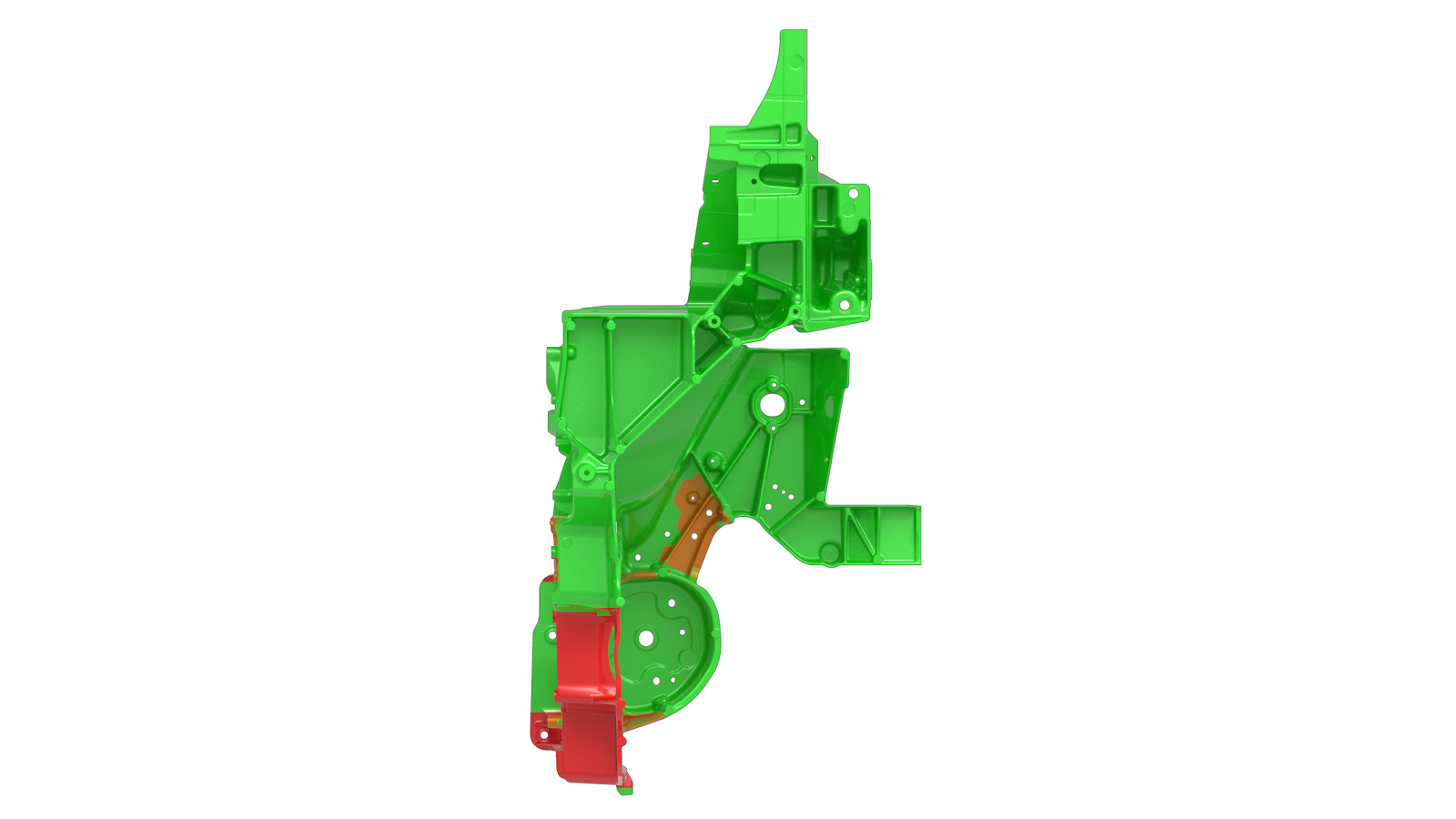 The images below show the cast Shock Tower from different angles, and contain highlighted areas. Compare the damaged area of the vehicle's Shock Tower to the images below, then use the repair criteria corresponding to the color of the highlighted area to find the criteria to use to determine if the damaged area of the component can be repaired.