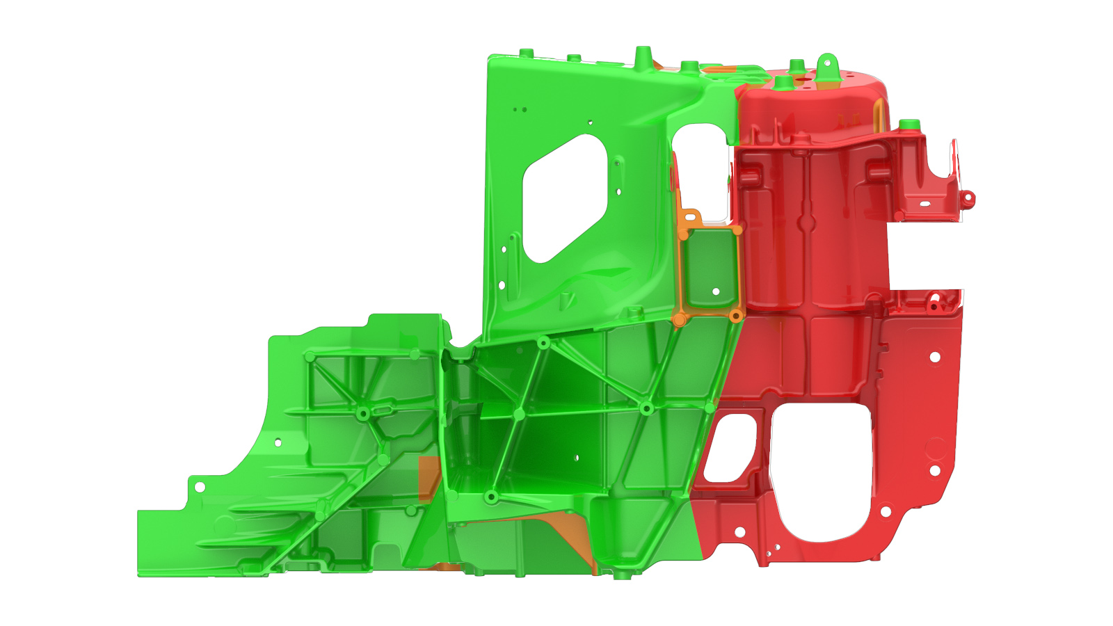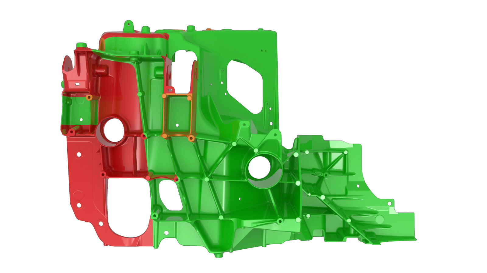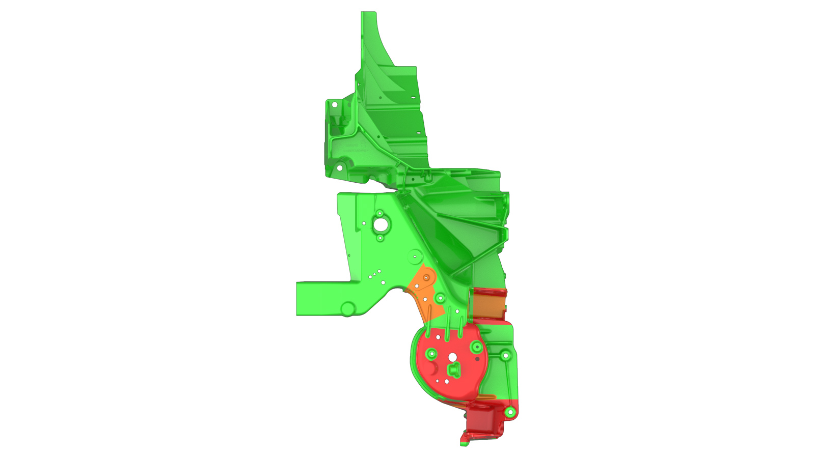 The images below show the cast Shock Tower from different angles, and contain highlighted areas. Compare the damaged area of the vehicle's Shock Tower to the images below, then use the repair criteria corresponding to the color of the highlighted area to find the criteria to use to determine if the damaged area of the component can be repaired.