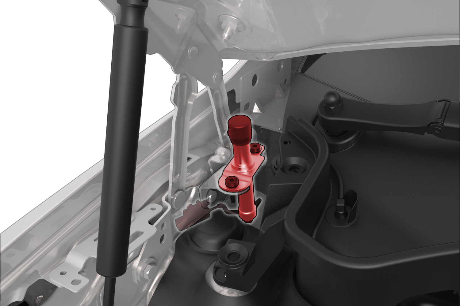 To determine if a vehicle is equipped with Pedestrian Protection components, open the hood and look for Pedestrian Protection hood actuators, as shown above.