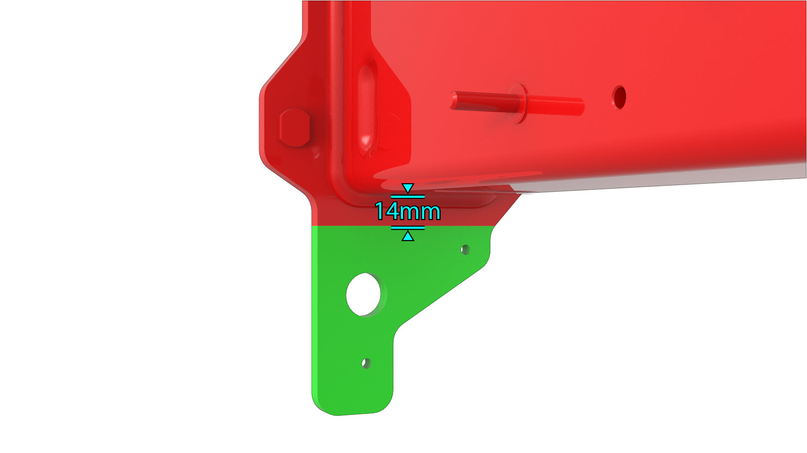 The image below shows the Front Frame Rail End Cap and contains highlighted areas. Compare the damaged area of the vehicle's Front Frame Rail End Cap to the image below, then use the repair criteria corresponding to the color of the highlighted area to find the criteria to use to determine if the damaged area of the component can be repaired.