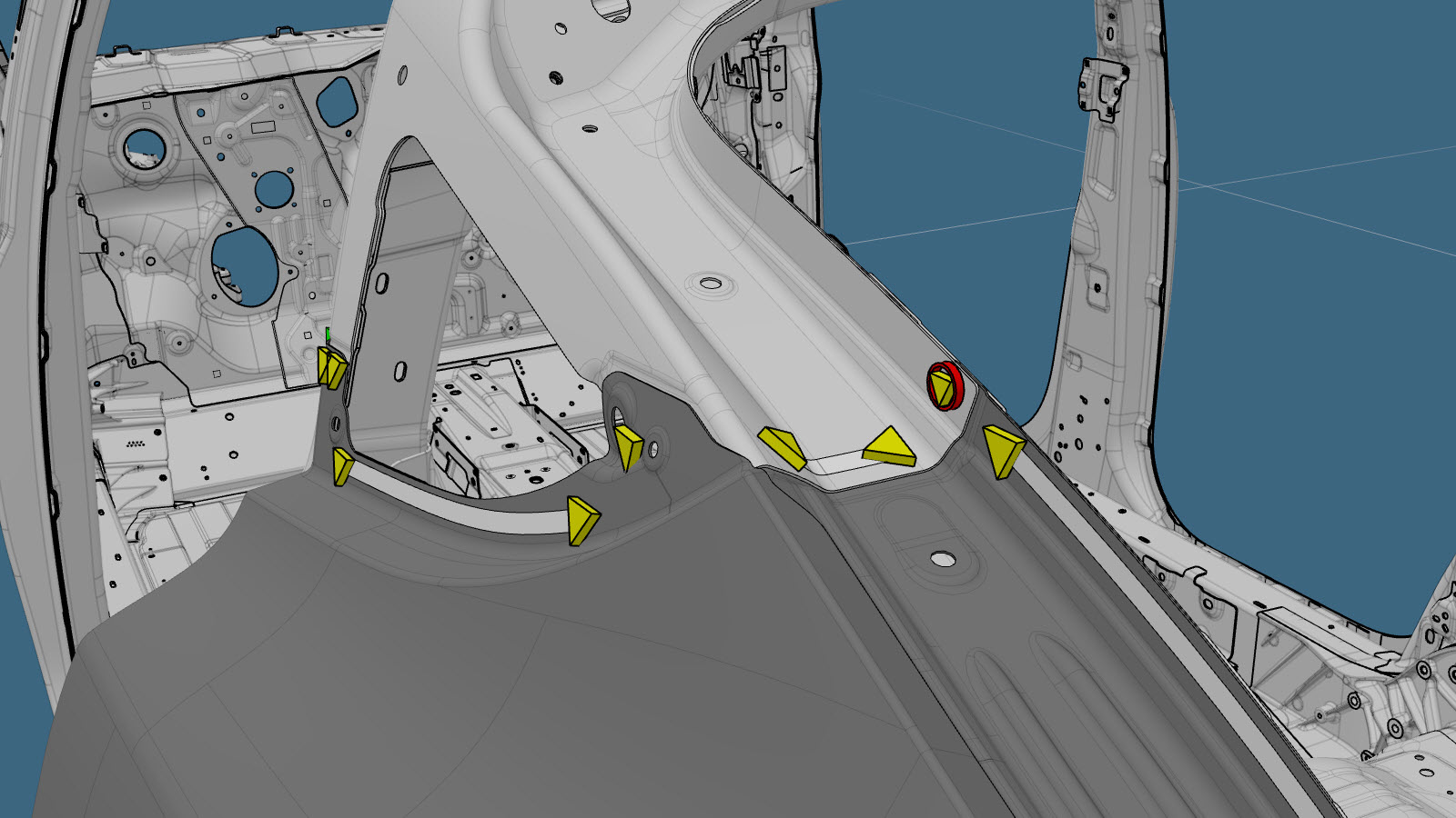 WarningFailure to follow all welding safety precautions, including the use of personal protective equipment, could result in serious injury or property damage. Only technicians who have completed Tesla’s approved welding training are authorized to weld structural components on Tesla vehicles.WarningTo maintain vehicle crash integrity, use only approved welding wire and an approved GMA welder to perform GMA welding on Tesla vehicles. Refer to Approved Gas Metal Arc (GMA) Welders and Welding Wire for information on approved GMA welders and welding wire.CAUTIONDo not weld on a Tesla vehicle before performing the Vehicle Electrical Isolation Procedure (refer to the vehicle-specific Service Manual for more information on the Vehicle Electrical Isolation Procedure). Welding on a Tesla vehicle with an energized high or low voltage system might damage vehicle components.NoteBefore GMA welding, a test weld using material of the same gauge and type should be performed to make sure that the welding equipment settings produce a satisfactory joint. - Fill the gap between the Quarter Outer panel and the Quarter Outer Lower panel (indicated in red) with urethane.