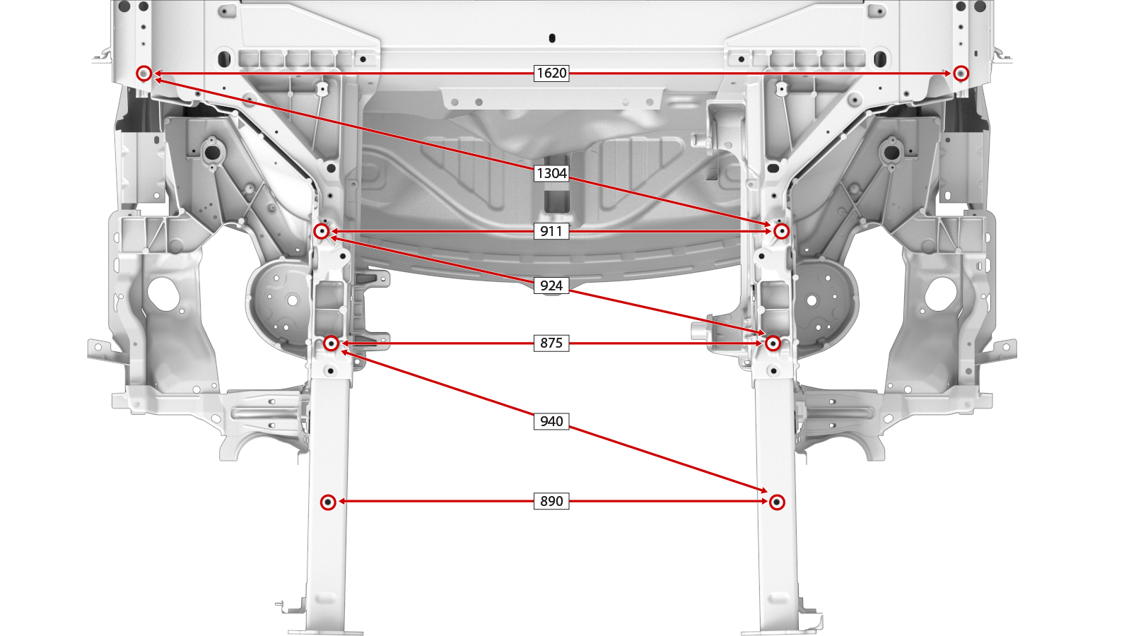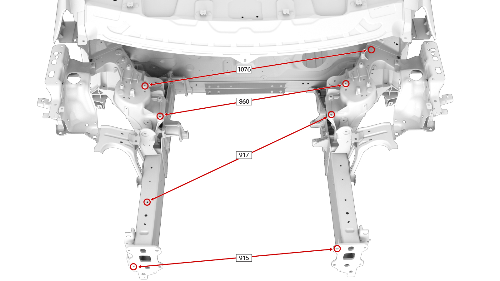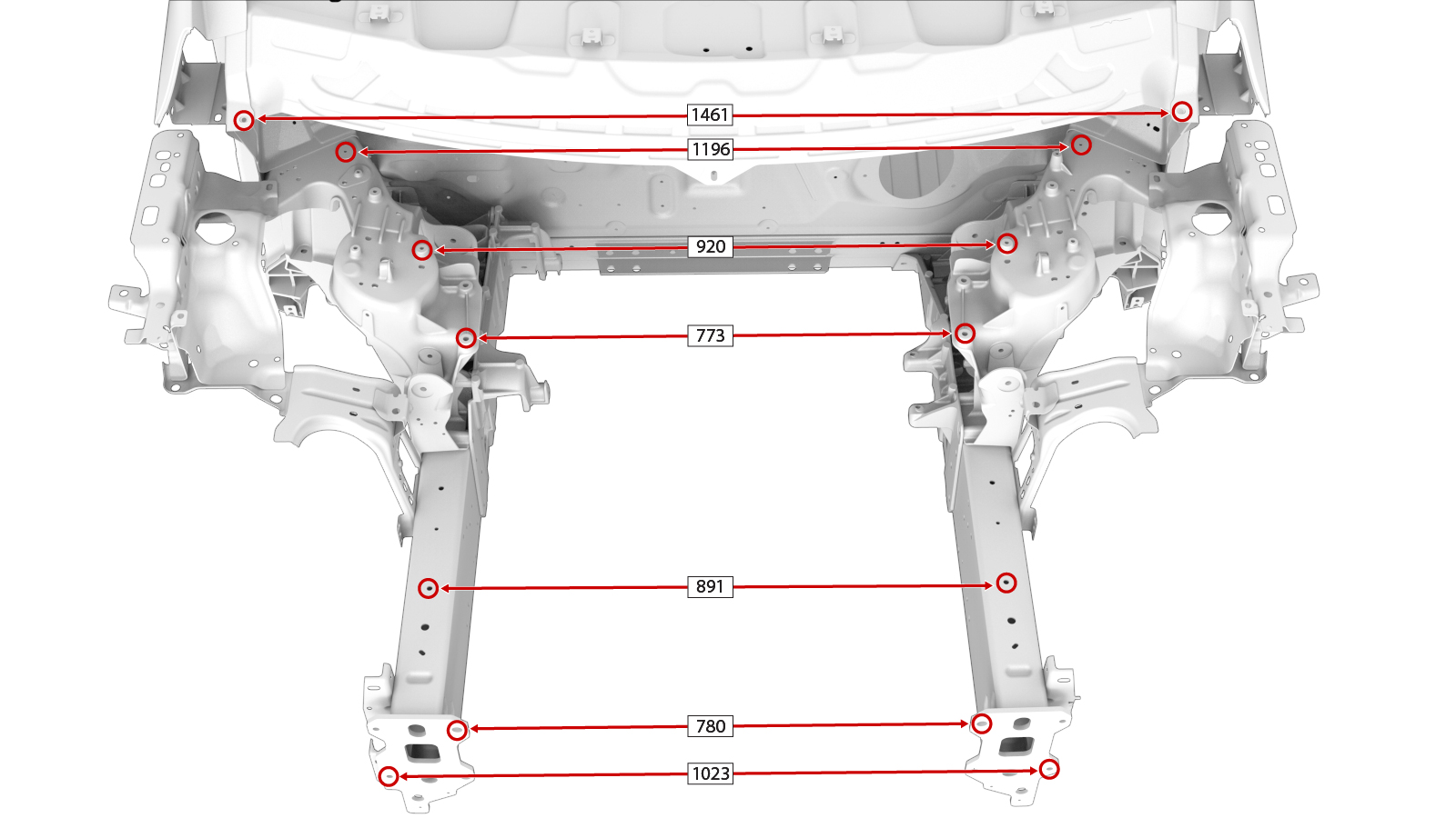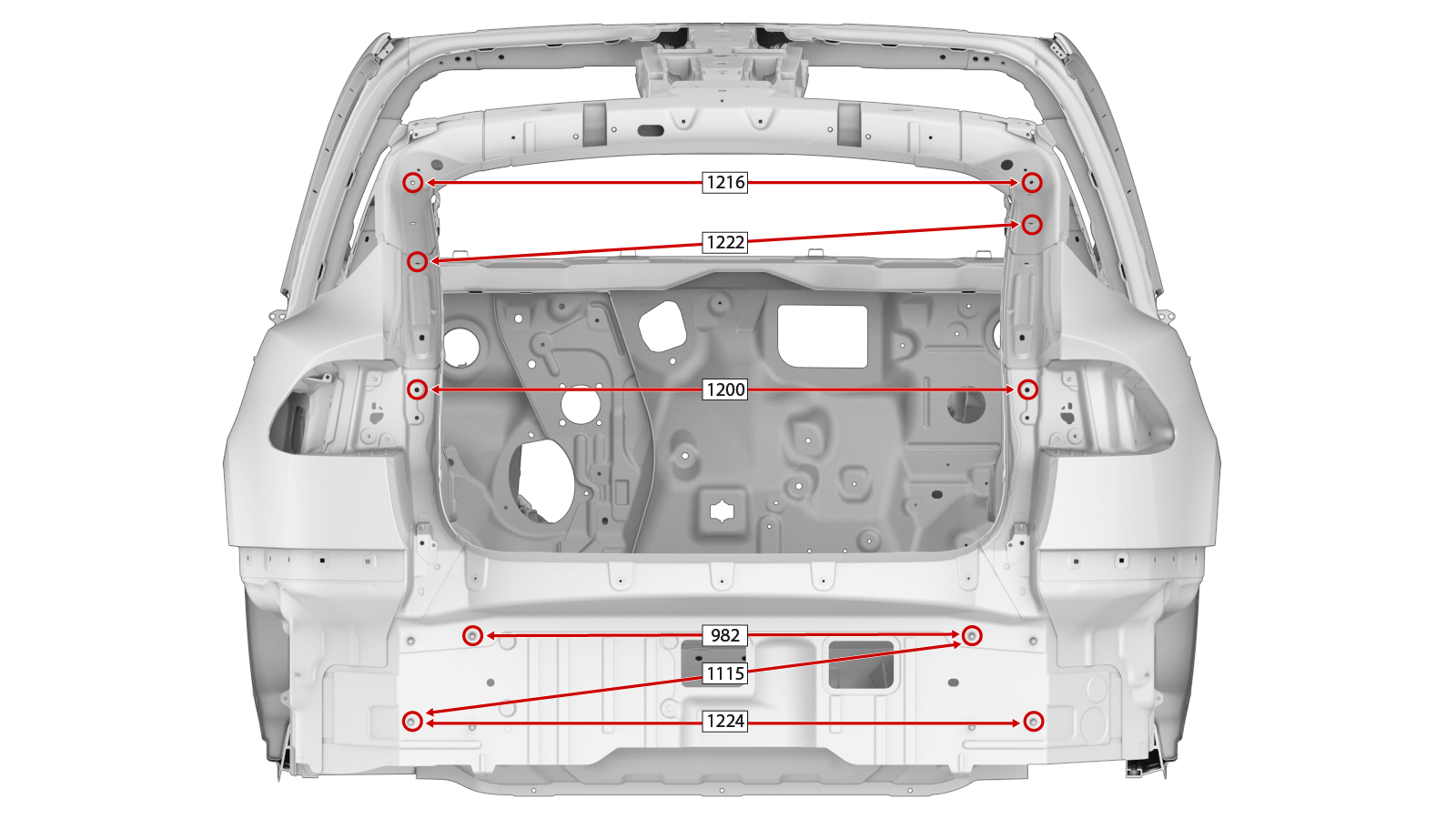 Lists the dimensions between known points on the vehicle for use in diagnosing vehicle damage.