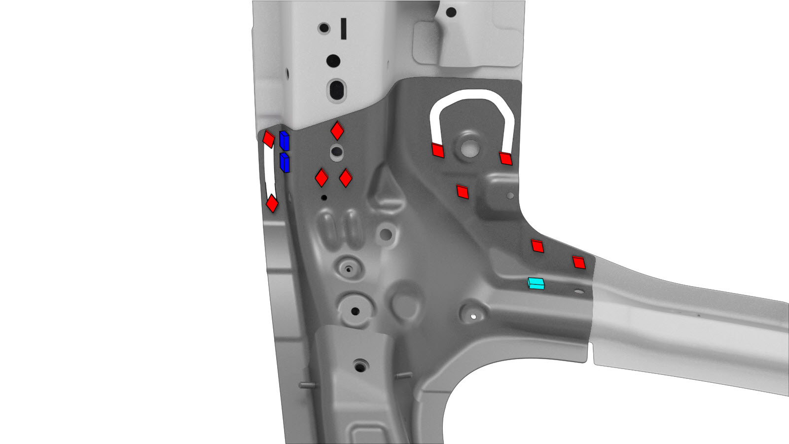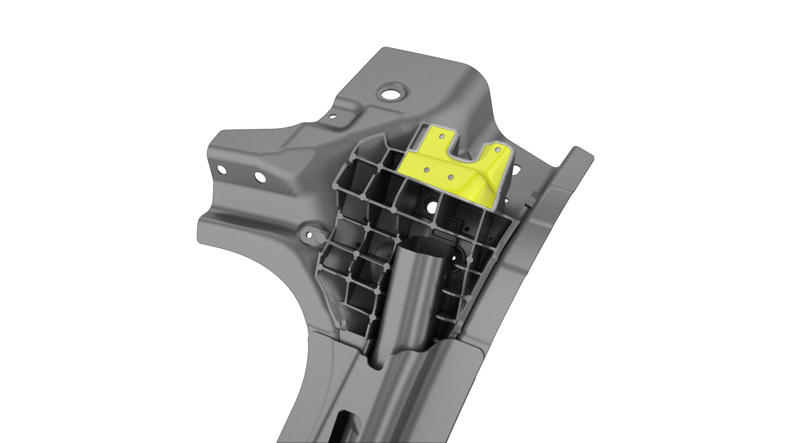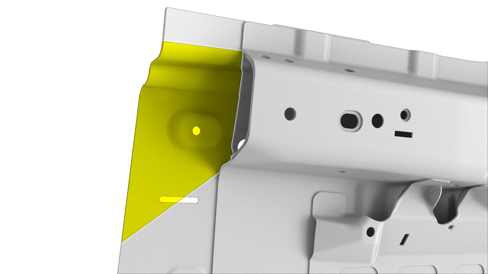Apply a layer of structural adhesive to the top structural foam in the nylon reinforcement block of the B–Pillar Gusset (highlighted in yellow). Also apply a primer layer of structural adhesive to the underside of the Front Header Upper to the area highlighted in yellow.