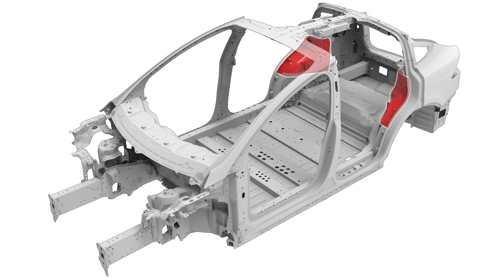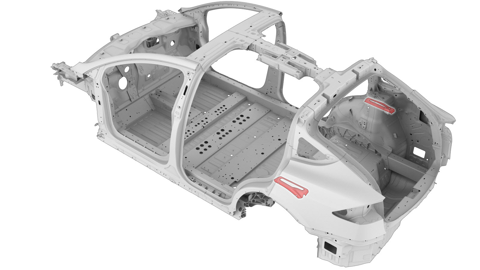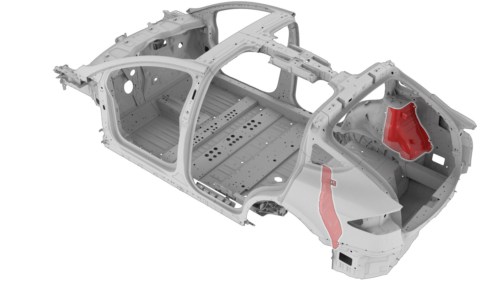 Rear Quarter Inner Panels D–Pillar Inner Reinforcement Double Spur Reinforcement (LH) Enclosure Attachment Bracket (Upper) Inner Wheelhouse Reinforcement Mount Rear Header Applique Bracket Rear Node Outer Reinforcement Rear Shock Tower NVH Reinforcement Rear Shock Tower Reinforcement Wheelhouse Extension (Front) Wheelhouse Front Wheelhouse Outer Wheelhouse Rear