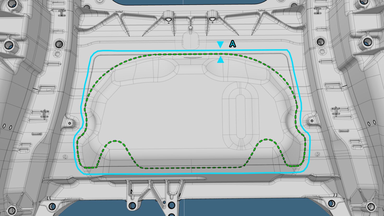 Cut only inside the traced line and remove only the necessary portions of the original cast Motor Cover. Leave at least 25 mm. between the cut line and traced line to create an overlap with the new Motor Cover.WarningDo not remove the attachment points for the Rear Motor Bay Noise Absorber on the underside of the Motor Cover.NoteRemove the minimum necessary portions of the front corners of the cast Motor Cover.