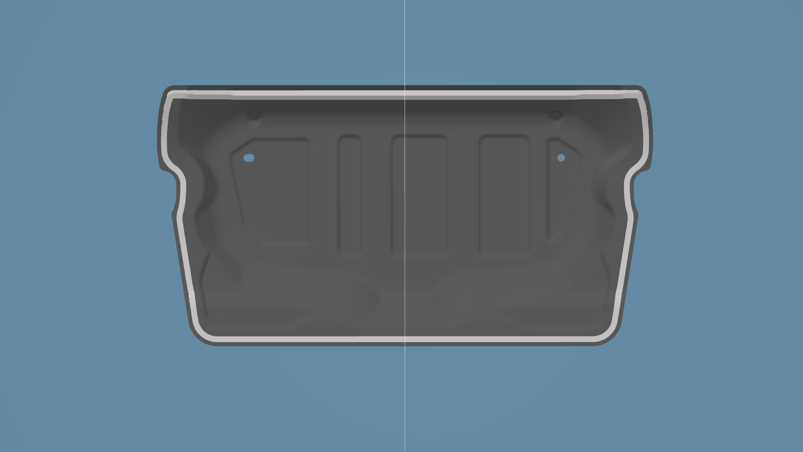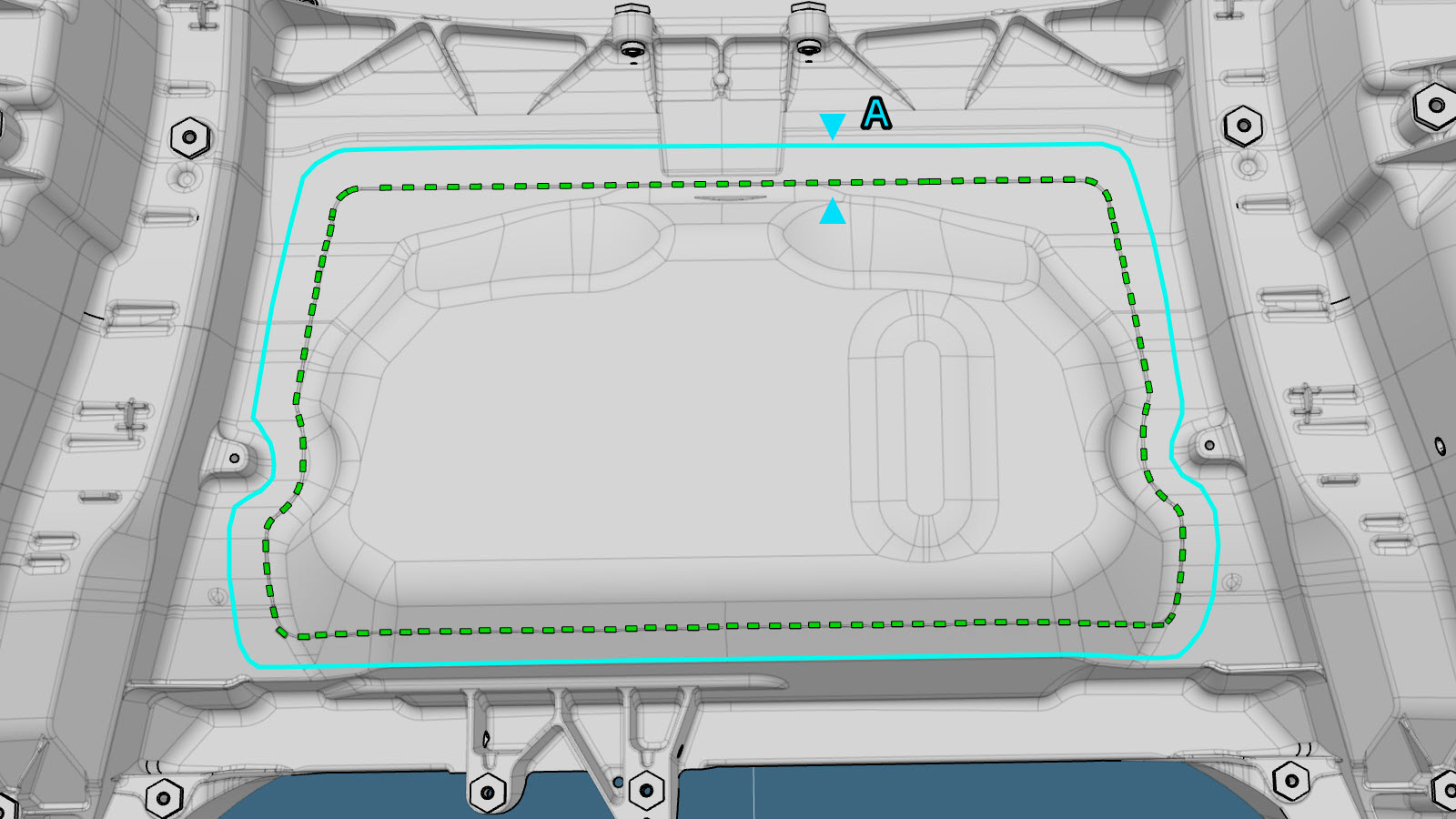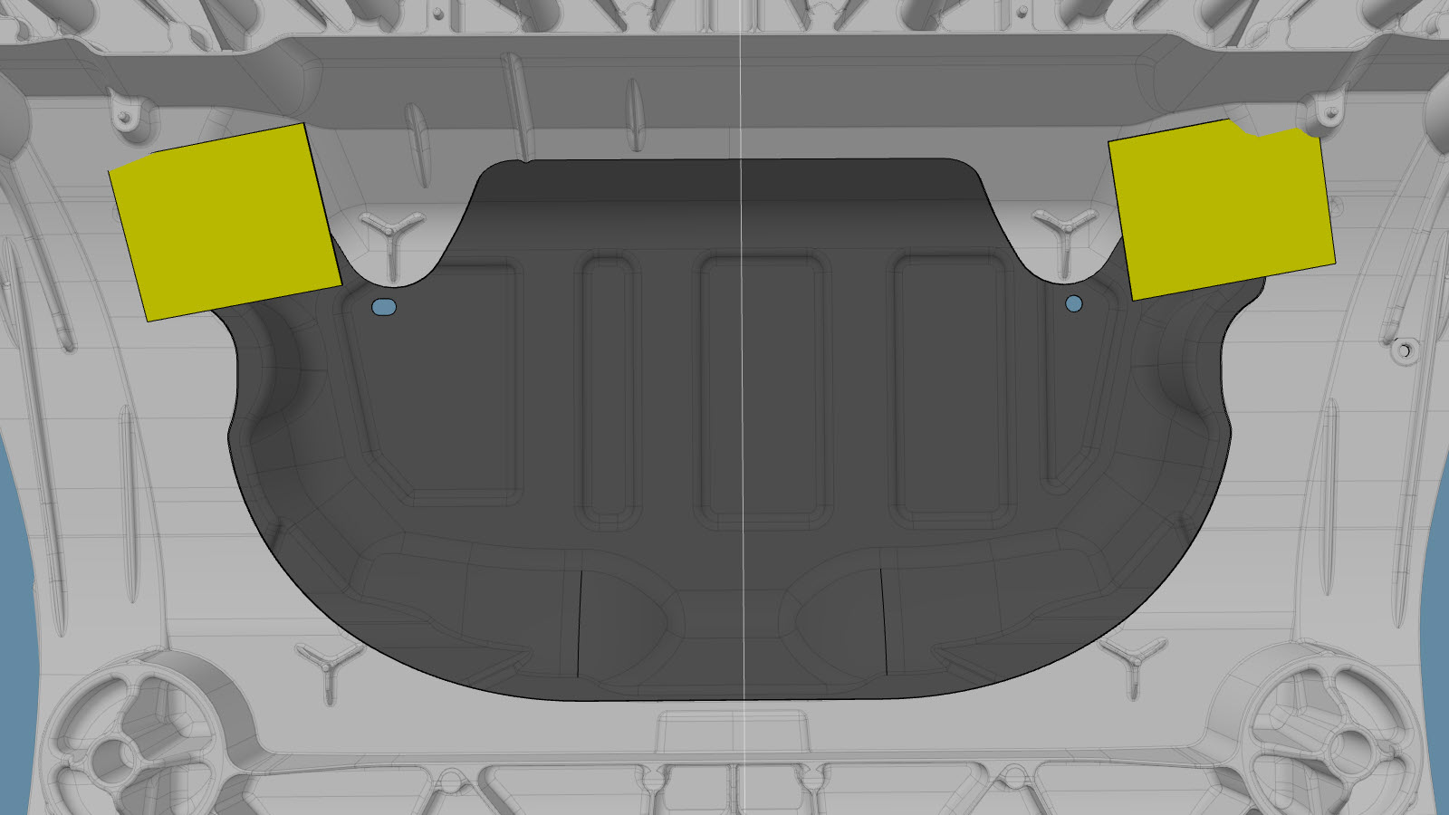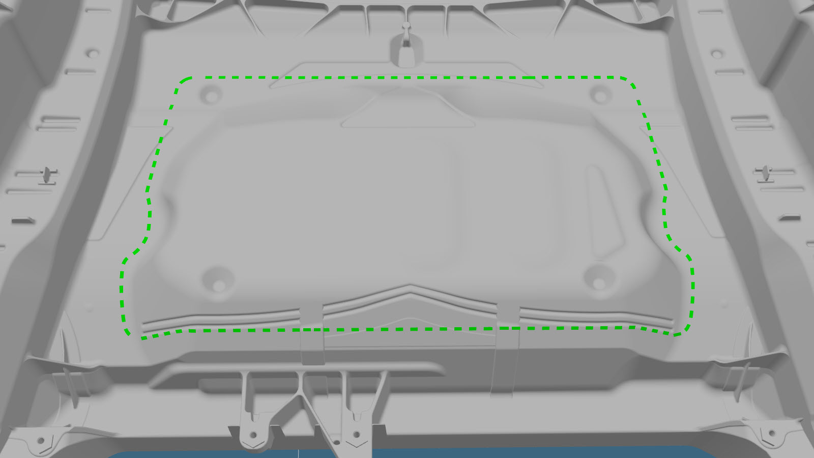 Trim the cast Motor Cover area, leaving a 25 mm. overlap with the new Motor Cover, or use the cast cutting line if present.NoteRemove only the necessary portions of the cast Motor Cover, but do not remove the attachment points for the NVH pad on the underside of the Motor Cover.NoteRemove only the necessary portions of the front corners of the cast Motor Cover.
