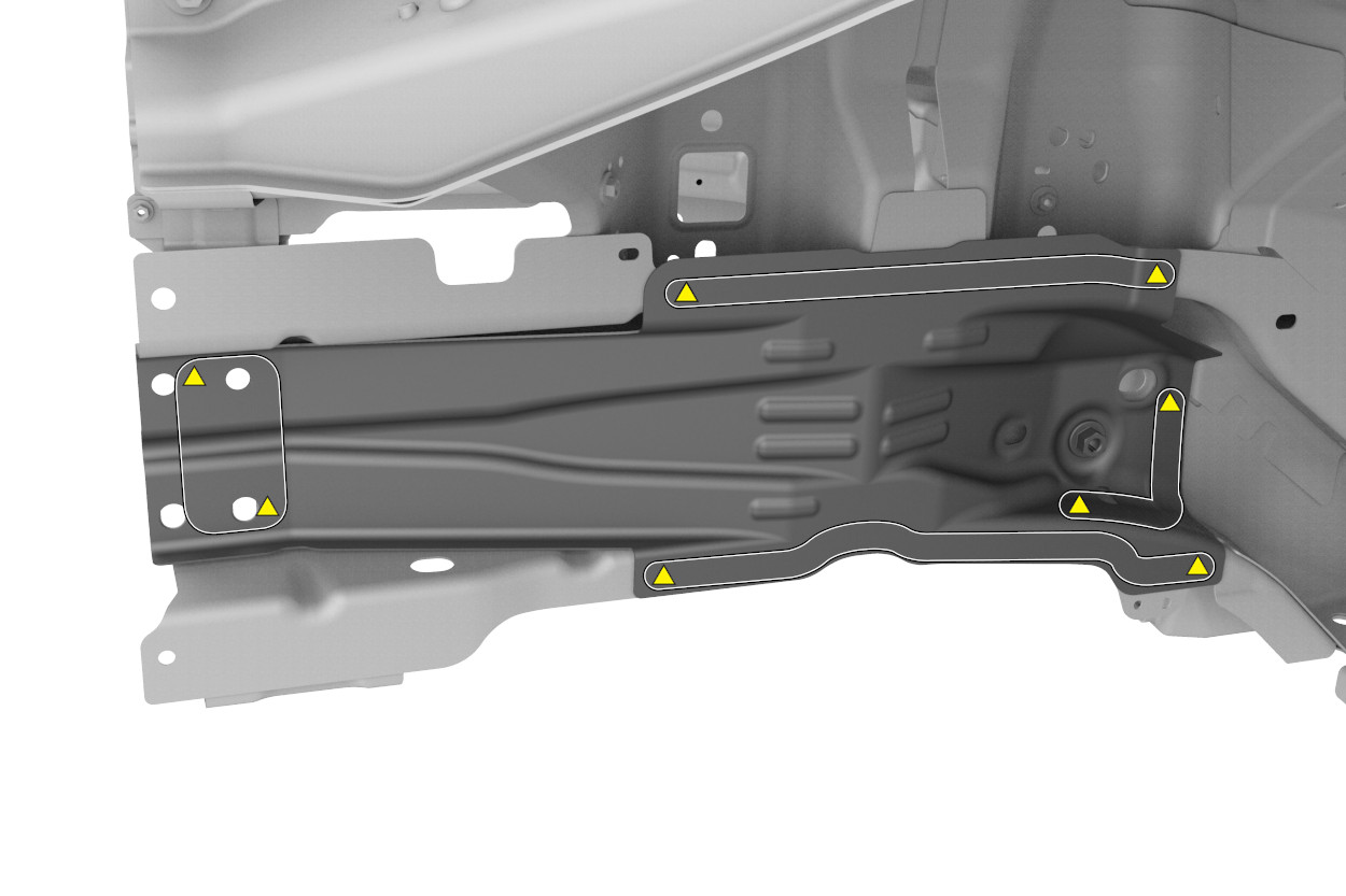 NoteMake sure all 4 holes in the new Front Frame Rail Inner Reinforcement are aligned with the 4 holes in the existing Front Frame Rail Inner. - Apply structural adhesive to the mating surfaces on the vehicle and the new component or components.