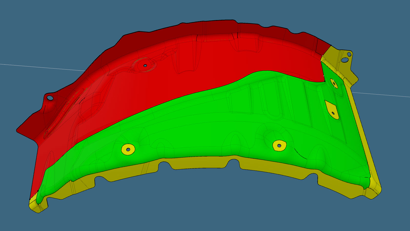 The image below shows the Wheelhouse Outer (complete). The colored areas indicate if sectioning is allowed. Compare the damaged area of the vehicle's Wheelhouse Outer to the image below, then use the repair criteria corresponding to the color of the highlighted area to find the criteria to use to determine if the damaged area of the component can be sectioned.