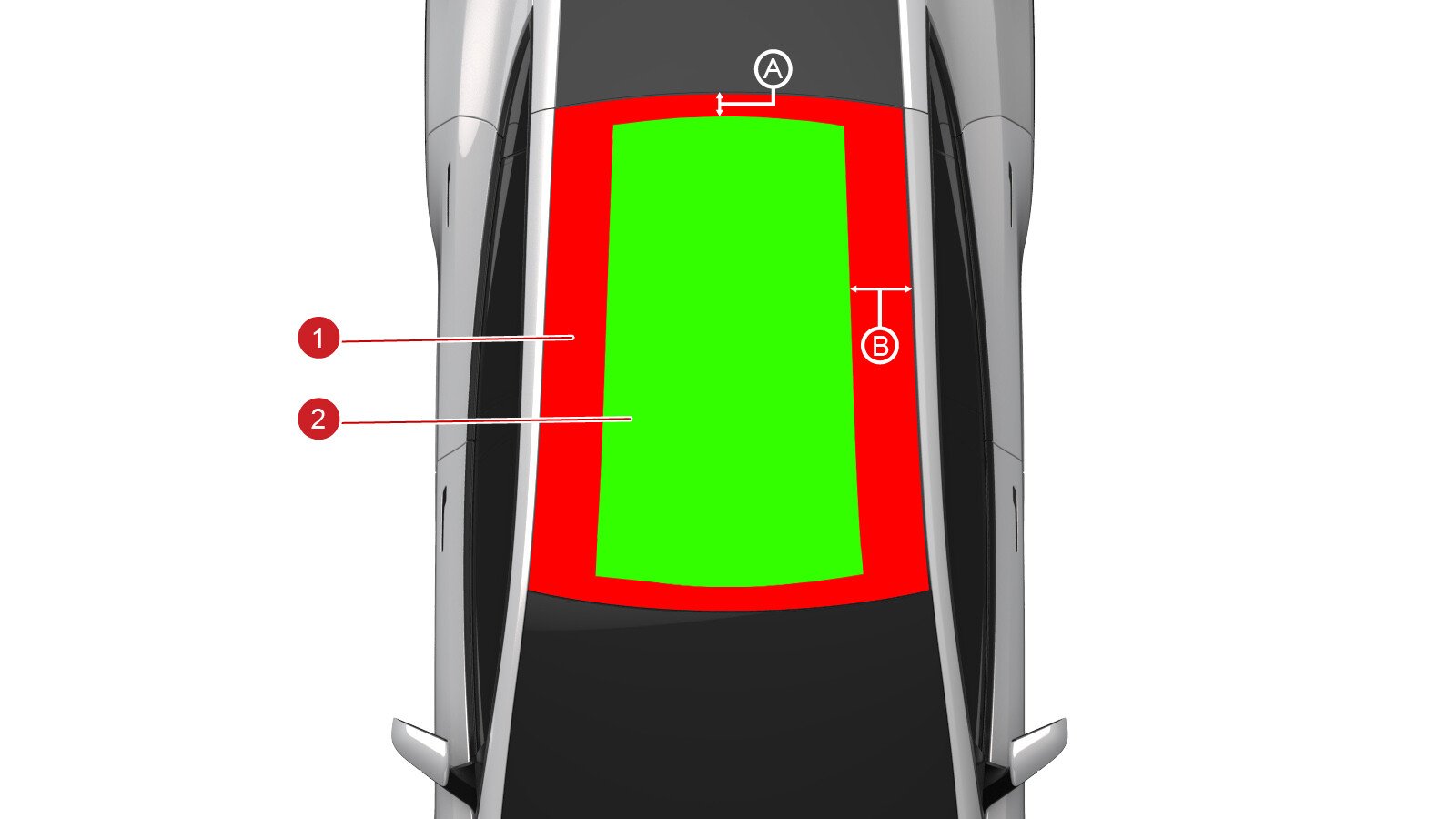 Repairs allowed in area 1: None; if the roof glass is damaged in this area, it must be replaced. |